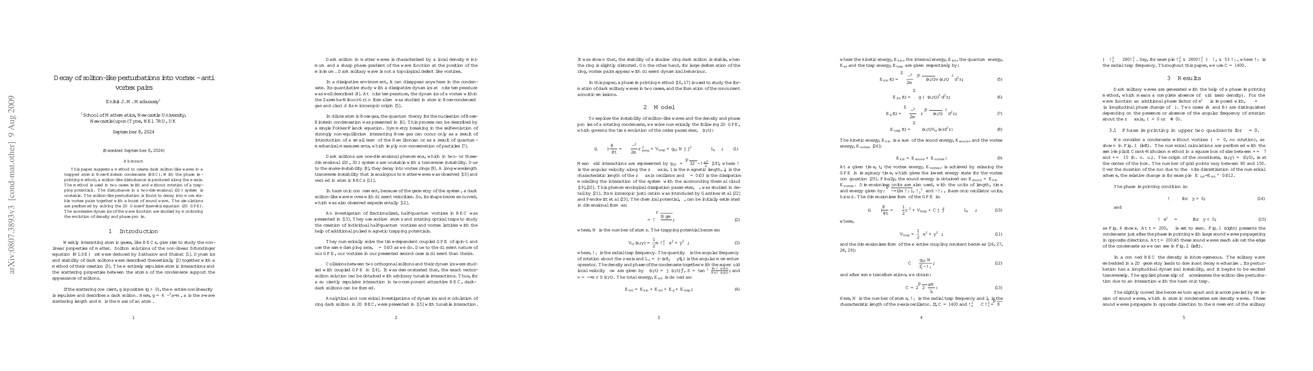 This research proposes an experimental method to generate soliton-like waves in a trapped atomic Bose-Einstein condensate (BEC), using phase imprinting. Simulations reveal that these soliton-like disturbances decay into stable vortex pairs and emit sound waves in a two-dimensional system with rotating or non-rotating asymmetric traps, as governed by the two-dimensional Gross-Pitaevskii equation (2D GPE).