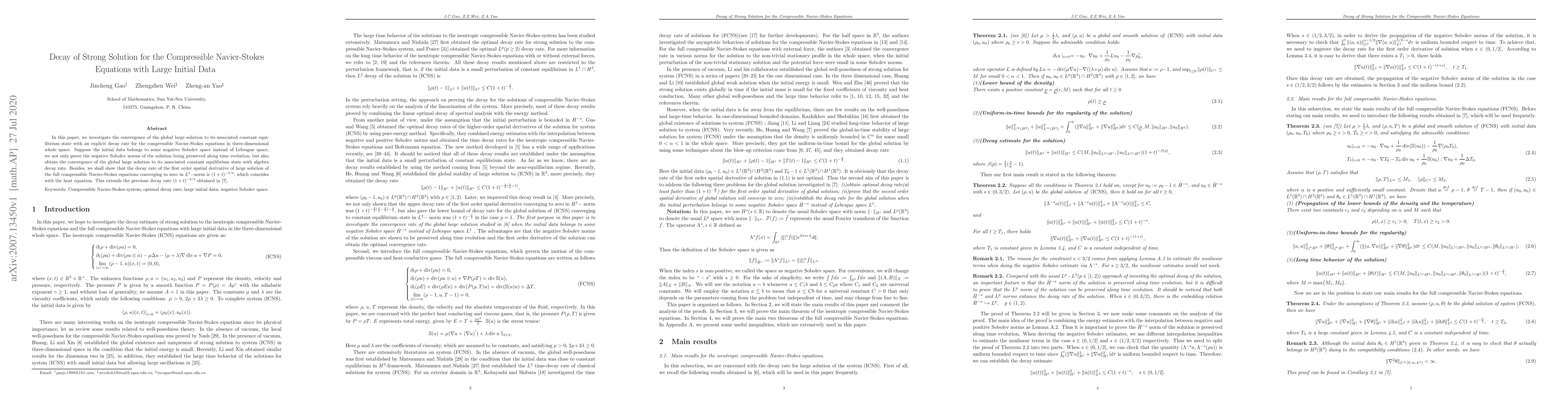 In this paper, we investigate the convergence of the global large solution to its associated constant equilibrium state with an explicit decay rate for the compressible Navier-Stokes equations in three-dimensional whole space. Suppose the initial data belongs to some negative Sobolev space instead of Lebesgue space, we not only prove the negative Sobolev norms of the solution being preserved along time evolution, but also obtain the convergence of the global large solution to its associated constant equilibrium state with algebra decay rate. Besides, we shall show that the decay rate of the first order spatial derivative of large solution of the full compressible Navier-Stokes equations converging to zero in $L^2-$norm is $(1+t)^{-5/4}$, which coincides with the heat equation. This extends the previous decay rate $(1+t)^{-3/4}$ obtained in \cite{he-huang-wang2}.