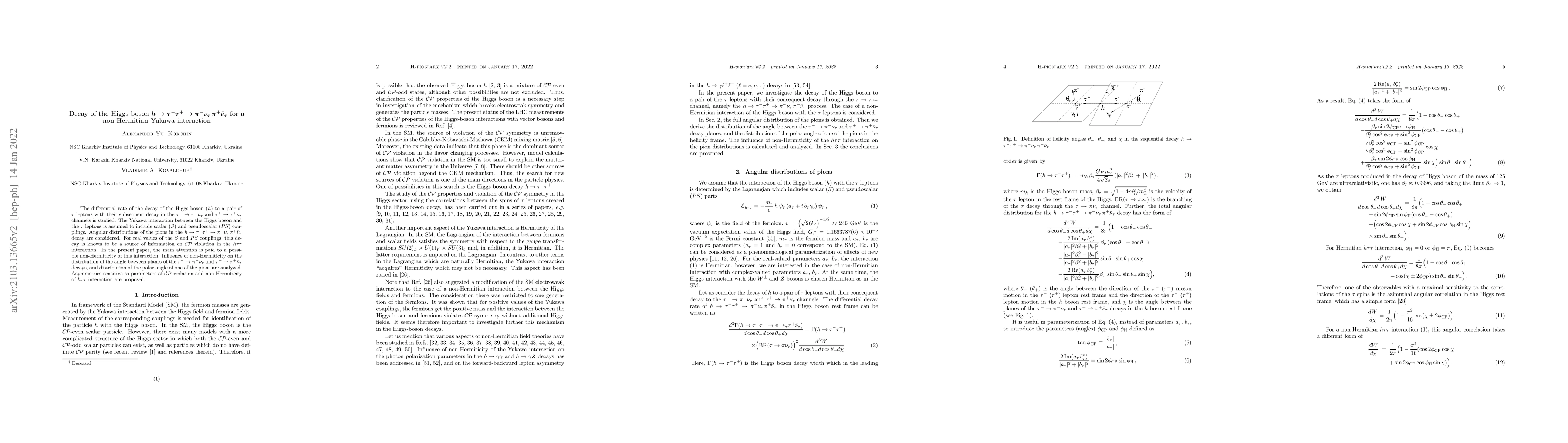 This paper investigates the decay of the Higgs boson into a pair of tau leptons and their subsequent decay into pions, focusing on the non-Hermitian nature of the Yukawa interaction. It proposes asymmetries to detect CP violation and non-Hermiticity in the Higgs-tau interaction.