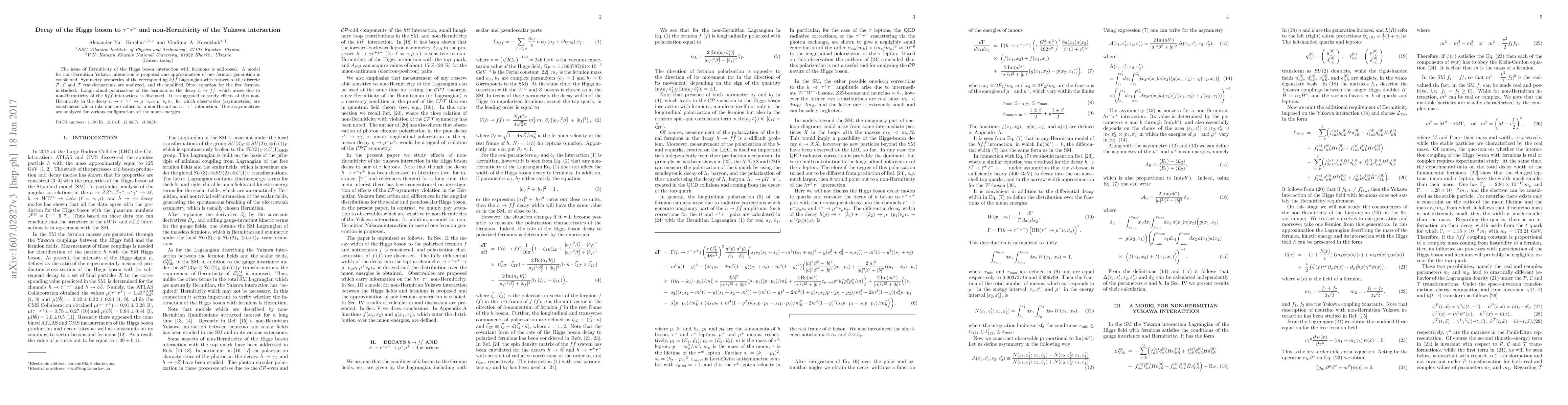 The issue of Hermiticity of the Higgs boson interaction with fermions is addressed. A model for non-Hermitian Yukawa interaction is proposed and approximation of one fermion generation is considered. Symmetry properties of the corresponding $h f \bar{f}$ Lagrangian with respect to the discrete P, C and T transformations are analyzed, and the modified Dirac equation for the free fermion is studied. Longitudinal polarization of the fermions in the decay $h \to f \bar{f}$, which arises due to non-Hermiticity of the $h f \bar{f}$ interaction, is discussed. It is suggested to study effects of this non-Hermiticity in the decay $h \to \tau^- \tau^+ \to \mu^- {\bar \nu}_\mu \nu_\tau \, \mu^+ \nu_\mu {\bar \nu}_\tau$, for which observables (asymmetries) are constructed which take nonzero values for a non-Hermitian $h \tau^- \tau^+$ interaction. These asymmetries are analyzed for various configurations of the muon energies.