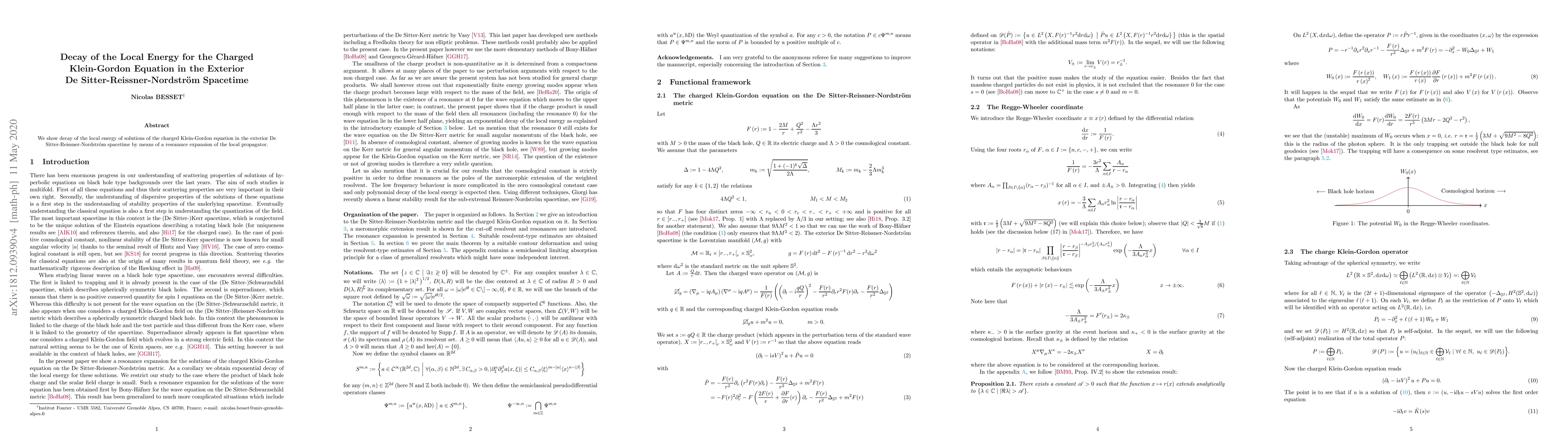 Summary: This paper demonstrates the decay of local energy for solutions of the charged Klein-Gordon equation in the exterior De Sitter-Reissner-Nordström spacetime, utilizing a resonance expansion of the local propagator to achieve this result.