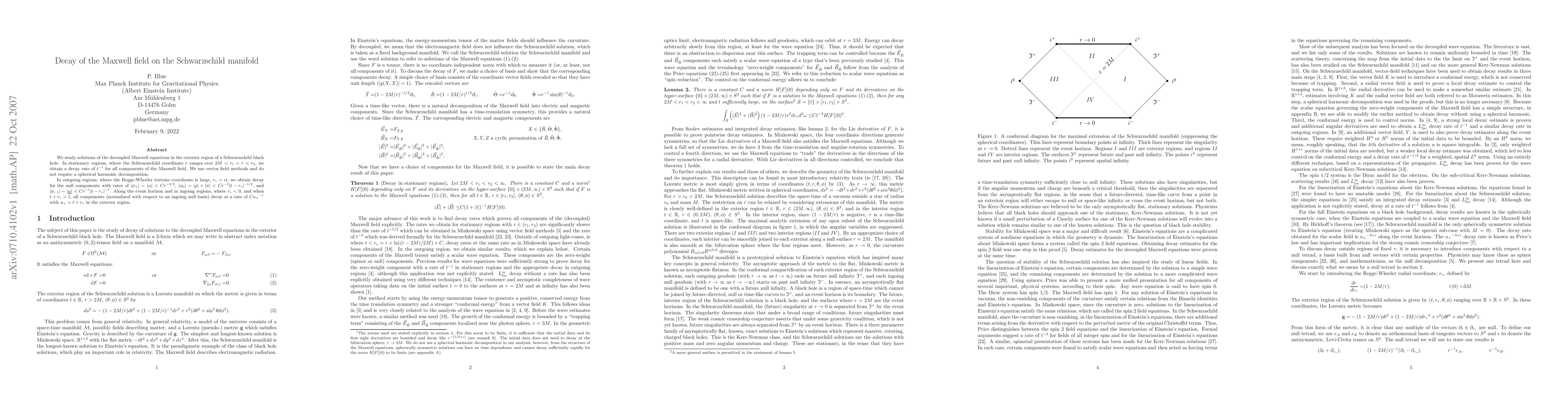 Research finds that Maxwell field decays at specific rates in regions near a Schwarzschild black hole, with decay rates varying between $t^{-1}$ and $C r^{-n}$ for different components of the field.