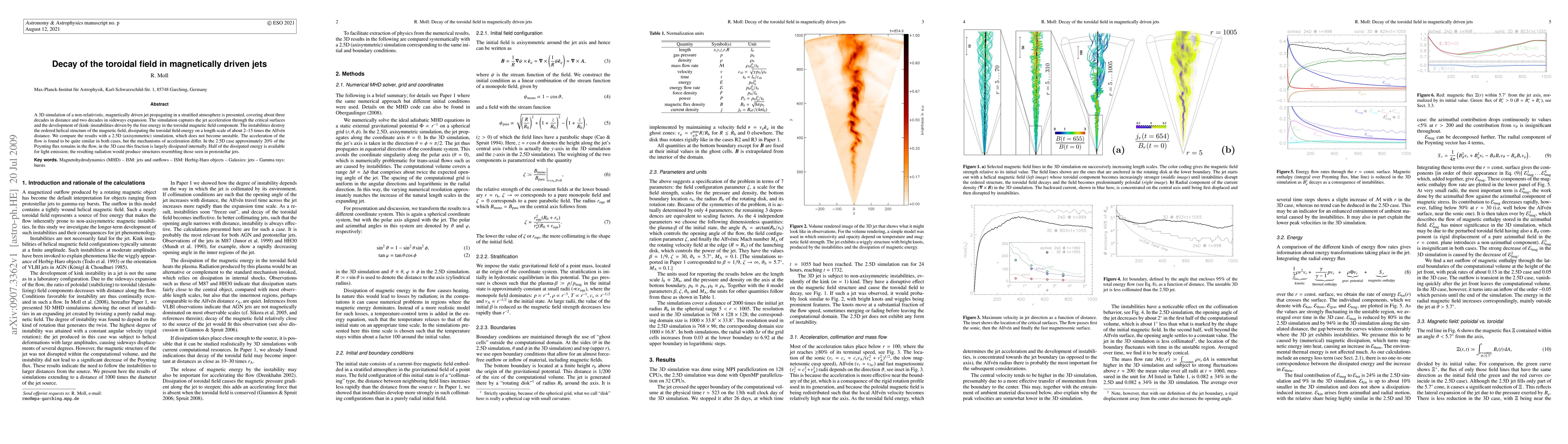 A 3D simulation of a non-relativistic, magnetically driven jet propagating in a stratified atmosphere is presented, covering about three decades in distance and two decades in sideways expansion. The simulation captures the jet acceleration through the critical surfaces and the development of (kink-)instabilities driven by the free energy in the toroidal magnetic field component. The instabilities destroy the ordered helical structure of the magnetic field, dissipating the toroidal field energy on a length scale of about 2-15 times the Alfven distance. We compare the results with a 2.5D (axisymmetric) simulation, which does not become unstable. The acceleration of the flow is found to be quite similar in both cases, but the mechanisms of acceleration differ. In the 2.5D case approximately 20% of the Poynting flux remains in the flow, in the 3D case this fraction is largely dissipated internally. Half of the dissipated energy is available for light emission; the resulting radiation would produce structures resembling those seen in protostellar jets.