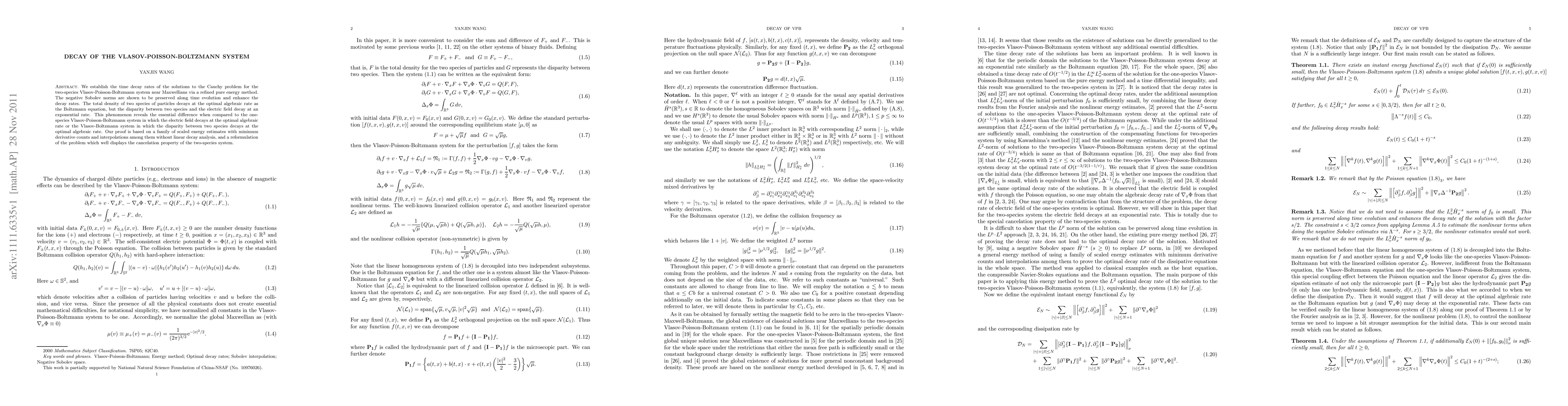 This paper establishes time decay rates for the two-species Vlasov-Poisson-Boltzmann system near Maxwellians, showing that negative Sobolev norms enhance decay rates. The total density decays at the optimal algebraic rate, while the disparity between species and the electric field decays exponentially, contrasting with the one-species system.