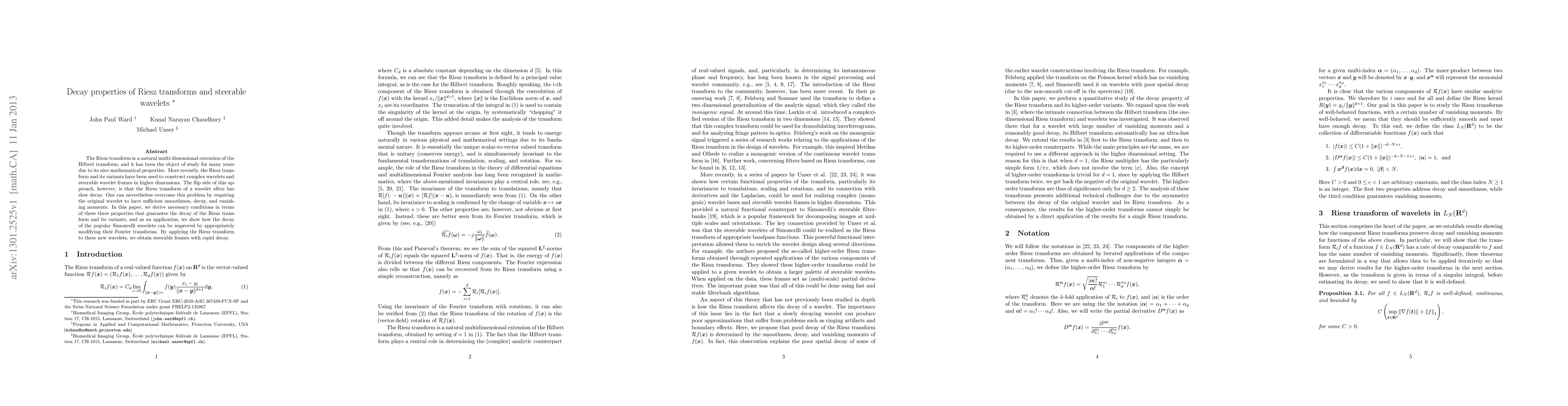 The Riesz transform is a natural multi-dimensional extension of the Hilbert transform, and it has been the object of study for many years due to its nice mathematical properties. More recently, the Riesz transform and its variants have been used to construct complex wavelets and steerable wavelet frames in higher dimensions. The flip side of this approach, however, is that the Riesz transform of a wavelet often has slow decay. One can nevertheless overcome this problem by requiring the original wavelet to have sufficient smoothness, decay, and vanishing moments. In this paper, we derive necessary conditions in terms of these three properties that guarantee the decay of the Riesz transform and its variants, and as an application, we show how the decay of the popular Simoncelli wavelets can be improved by appropriately modifying their Fourier transforms. By applying the Riesz transform to these new wavelets, we obtain steerable frames with rapid decay.