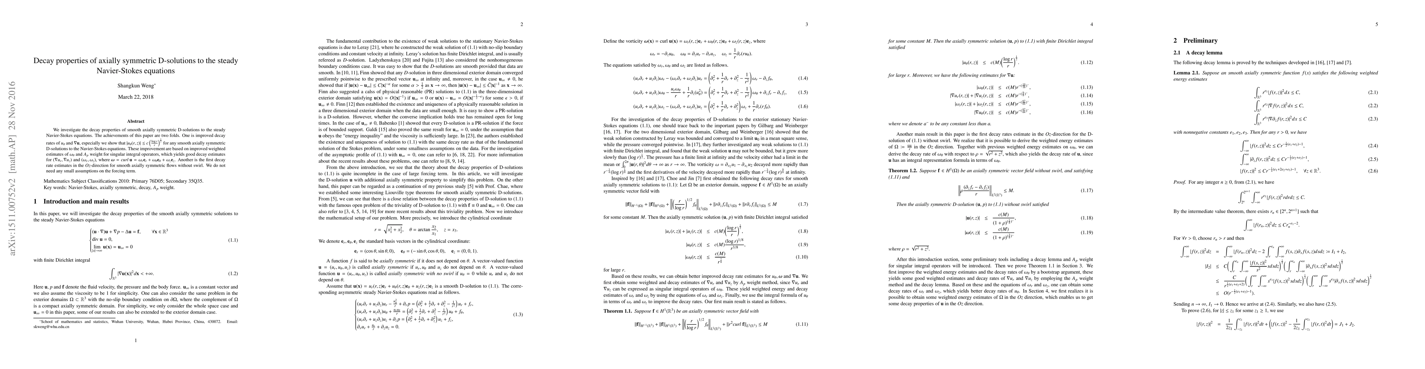 This paper investigates the decay properties of smooth axially symmetric D-solutions to the steady Navier-Stokes equations, achieving improved decay rates for $u_{\th}$ and $\nabla \mathbf{u}$ and providing the first decay rate estimates in the $Oz$-direction for smooth axially symmetric flows without swirl, without requiring small assumptions on the forcing term.