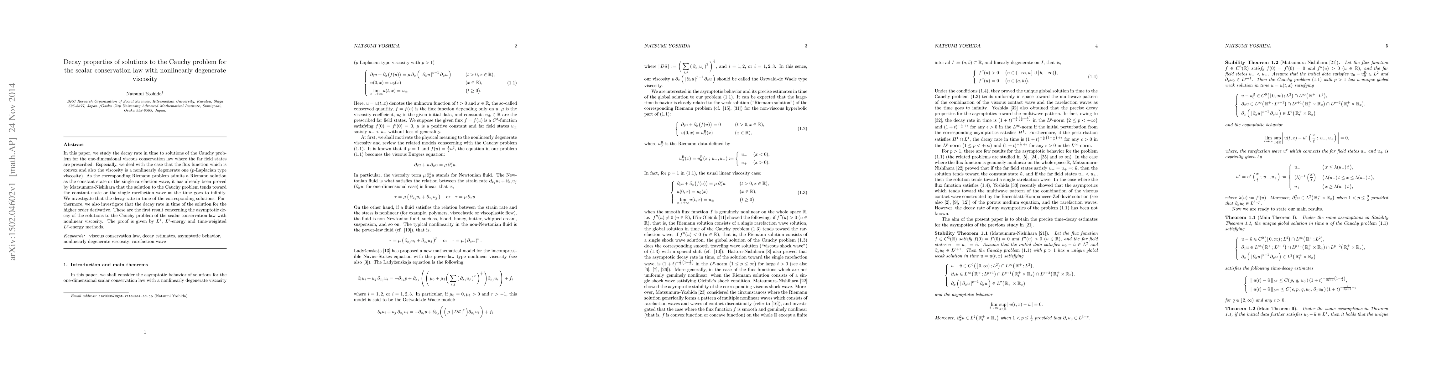 In this paper, we study the decay rate in time to solutions of the Cauchy problem for the one-dimensional viscous conservation law where the far field states are prescribed. Especially, we deal with the case that the flux function which is convex and also the viscosity is a nonlinearly degenerate one (p-Laplacian type viscosity). As the corresponding Riemann problem admits a Riemann solution as the constant state or the single rarefaction wave, it has already been proved by Matsumura-Nishihara that the solution to the Cauchy problem tends toward the constant state or the single rarefaction wave as the time goes to infinity. We investigate that the decay rate in time of the corresponding solutions. Furthermore, we also investigate that the decay rate in time of the solution for the higher order derivative. These are the first result concerning the asymptotic decay of the solutions to the Cauchy problem of the scalar conservation law with nonlinear viscosity. The proof is given by L1, L2-energy and time-weighted Lq-energy methods.