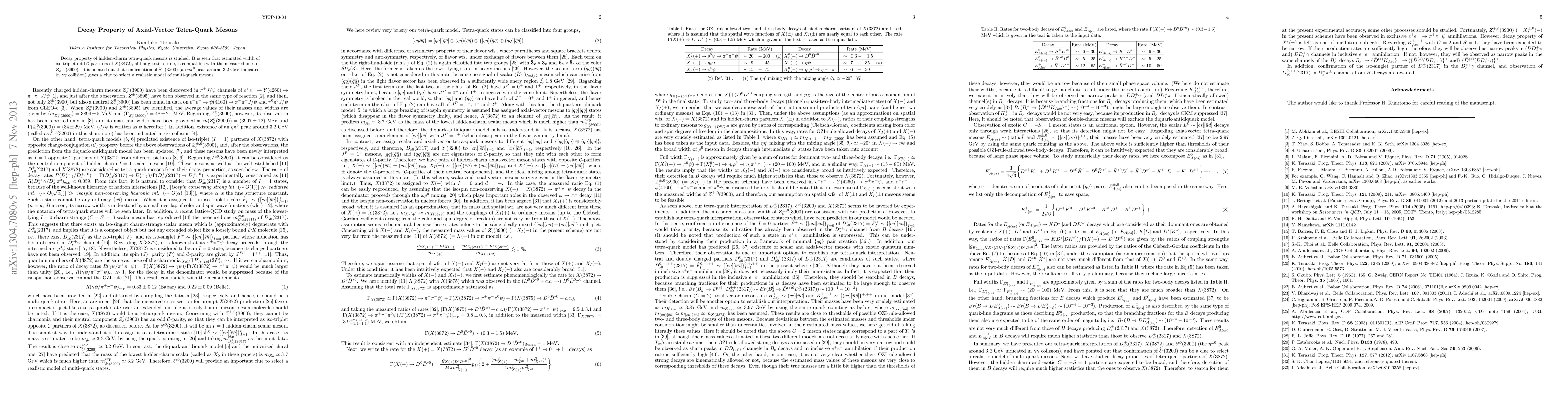 Decay property of hidden-charm tetra-quark mesons is studied. It is seen that estimated width of iso-triplet odd $\mathcal{C}$ partners of X(3872), although still crude, is compatible with the measured ones of Z_c(3900). It is pointed out that confirmation of an eta-pi^0 peak around 3.2 GeV indicated in gamma-gamma collisions gives a clue to select a realistic model of multi-quark mesons.