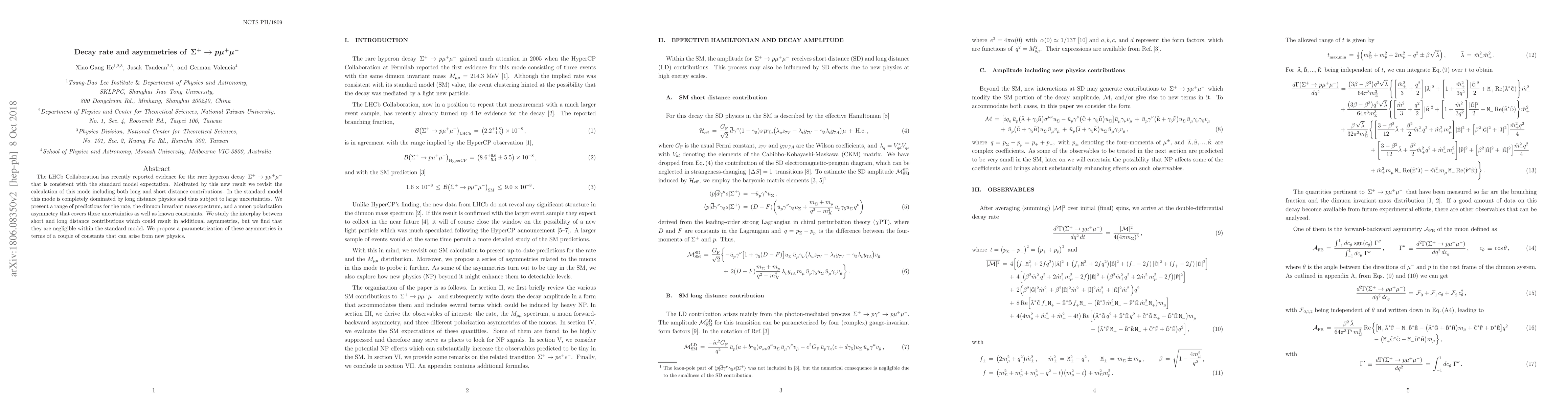 The LHCb Collaboration has recently reported evidence for the rare hyperon decay $\Sigma^+\to p\mu^+\mu^-$ that is consistent with the standard model expectation. Motivated by this new result we revisit the calculation of this mode including both long and short distance contributions. In the standard model this mode is completely dominated by long distance physics and thus subject to large uncertainties. We present a range of predictions for the rate, the dimuon invariant mass spectrum, and a muon polarization asymmetry that covers these uncertainties as well as known constraints. We study the interplay between short and long distance contributions which could result in additional asymmetries, but we find that they are negligible within the standard model. We propose a parameterization of these asymmetries in terms of a couple of constants that can arise from new physics.