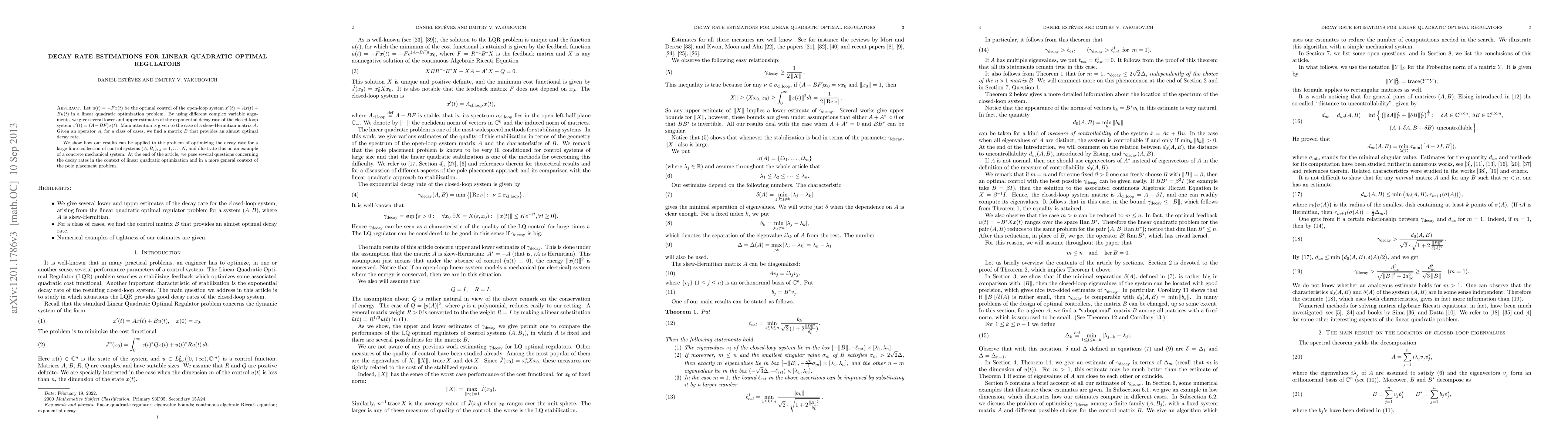 Let $u(t)=-Fx(t)$ be the optimal control of the open-loop system $x'(t)=Ax(t)+Bu(t)$ in a linear quadratic optimization problem. By using different complex variable arguments, we give several lower and upper estimates of the exponential decay rate of the closed-loop system $x'(t)=(A-BF)x(t)$. Main attention is given to the case of a skew-Hermitian matrix $A$. Given an operator $A$, for a class of cases, we find a matrix $B$ that provides an almost optimal decay rate. We show how our results can be applied to the problem of optimizing the decay rate for a large finite collection of control systems $(A, B_j)$, $j=1, \dots, N$, and illustrate this on an example of a concrete mechanical system. At the end of the article, we pose several questions concerning the decay rates in the context of linear quadratic optimization and in a more general context of the pole placement problem.