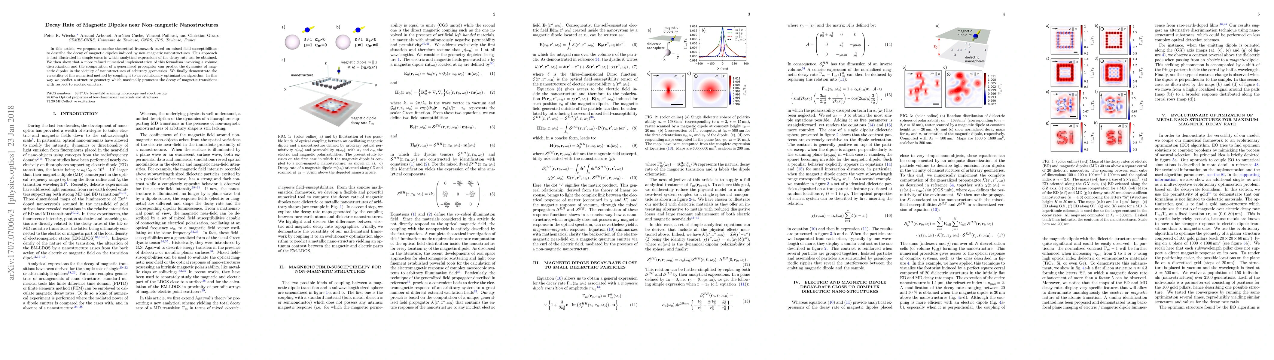 In this article, we propose a concise theoretical framework based on mixed field-susceptibilities to describe the decay of magnetic dipoles induced by non--magnetic nanostructures. This approach is first illustrated in simple cases in which analytical expressions of the decay rate can be obtained. We then show that a more refined numerical implementation of this formalism involving a volume discretization and the computation of a generalized propagator can predict the dynamics of magnetic dipoles in the vicinity of nanostructures of arbitrary geometries. We finally demonstrate the versatility of this numerical method by coupling it to an evolutionary optimization algorithm. In this way we predict a structure geometry which maximally promotes the decay of magnetic transitions with respect to electric emitters.