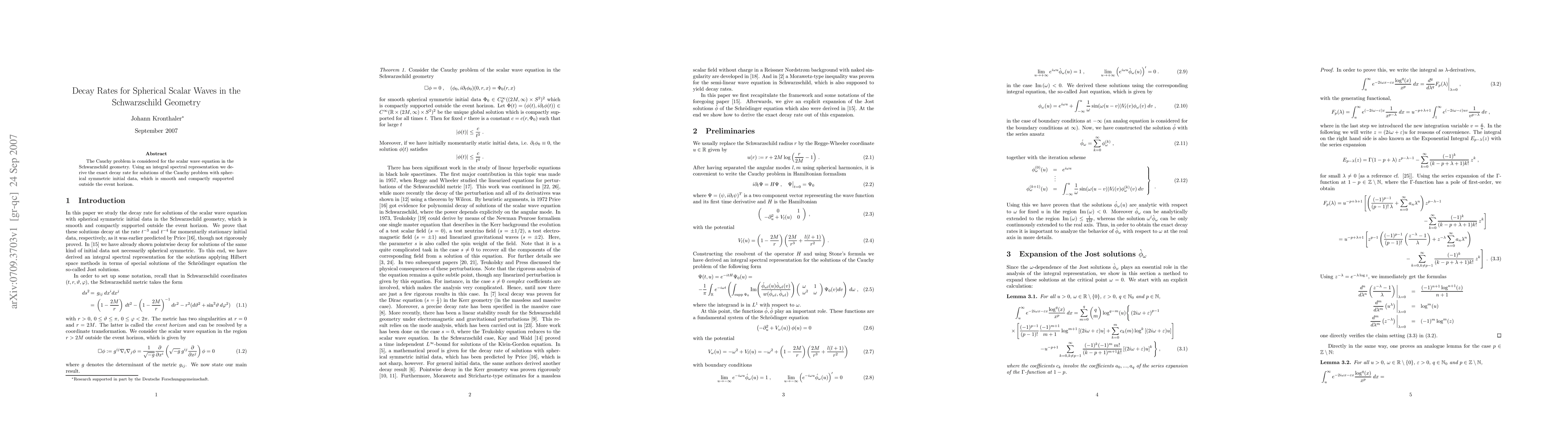 This research derives exact decay rates for spherical scalar waves in Schwarzschild geometry using an integral spectral representation, applicable to smooth and compactly supported initial data outside the event horizon.