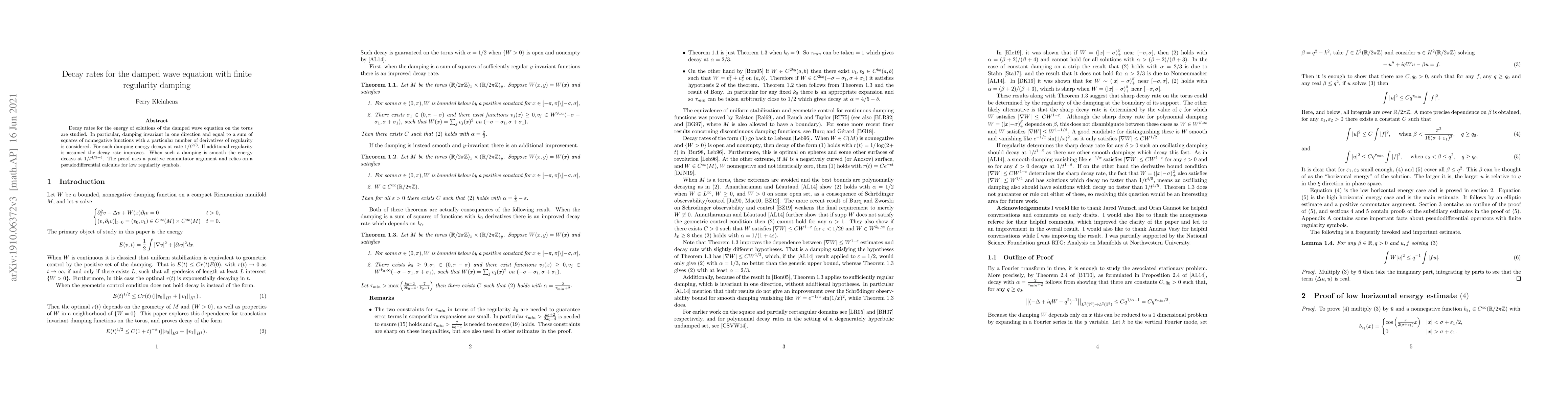 This paper investigates the decay rates of solutions to the damped wave equation on the torus, focusing on damping with finite regularity. The study finds that the energy decays at a rate of $1/t^{2/3}$ for general damping, improving to $1/t^{4/5-\delta}$ when the damping is smooth. The proof employs a positive commutator argument and pseudodifferential calculus.