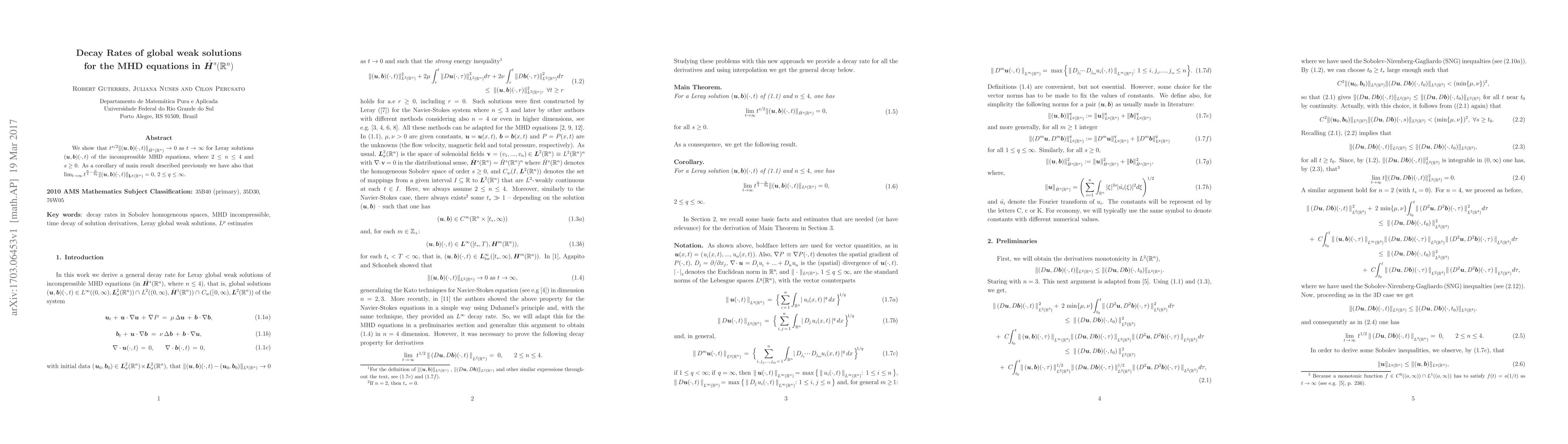 We show that $t^{s/2} \Vert (\mbox{\boldmath $u$},\mbox{\boldmath $b$})(.,t)\Vert_{\dot{H}(\mathbb{R}^{n})} \rightarrow 0,$ as $t\rightarrow \infty$ for Leray solutions $(\mbox{\boldmath $u$}, \mbox{\boldmath $b$})(.,t)$ of the incompressible MHD equations, where $2 \leq n \leq 4$ and $s \geq 0.$ As a corollary of main result described previously we have also that $\lim_{t\rightarrow\infty} t^{\frac{n}{2} - \frac{n}{2q}} \Vert(\mbox{\boldmath $u$},\mbox{\boldmath $b$})(.,t)\Vert_{L^{q}(\mathbb{R}^{n})} = 0, 2\leq q\leq \infty.$
