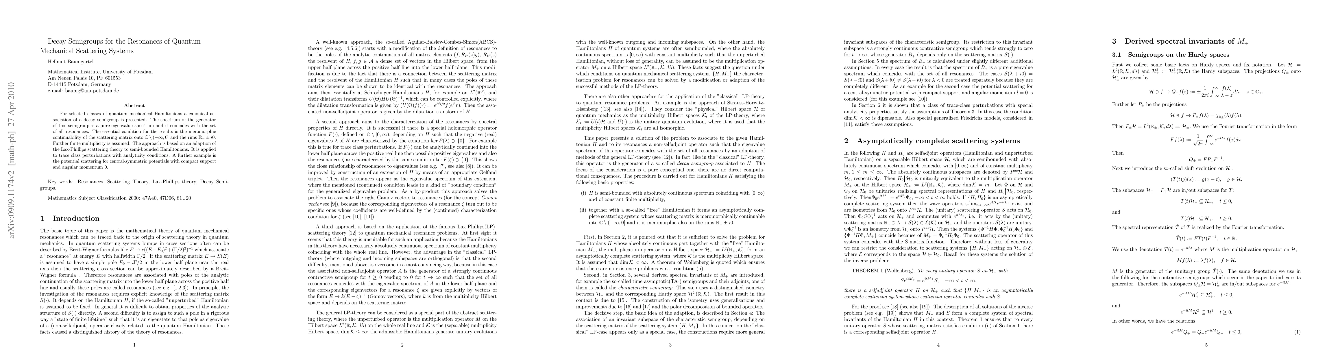 For selected classes of quantum mechanical Hamiltonians a canonical association of a decay semigroup is presented. The spectrum of the generator of this semigroup is a pure eigenvalue spectrum and it coincides with the set of all resonances. The essential condition for the results is the meromorphic continuability of the scattering matrix onto $\Bbb{C}\setminus(-\infty,0]$ and the rims $\Bbb{R}_{-}\pm i0$. Further finite multiplicity is assumed. The approach is based on an adaption of the Lax-Phillips scattering theory to semi-bounded Hamiltonians. It is applied to trace class perturbations with analyticity conditions. A further example is the potential scattering for central-symmetric potentials with compact support and angular momentum 0.