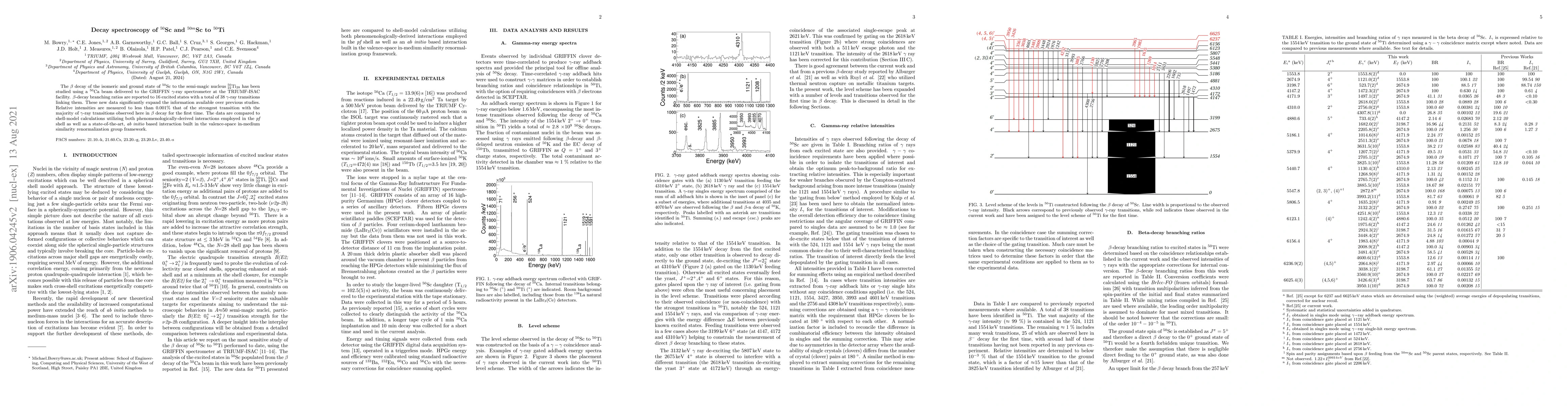 Researchers used a beam of $^{50}$Ca to study the decay of $^{50}$Sc and $^{50m}$Sc into $^{50}$Ti, revealing 38 new gamma-ray transitions with highly accurate relative intensities.