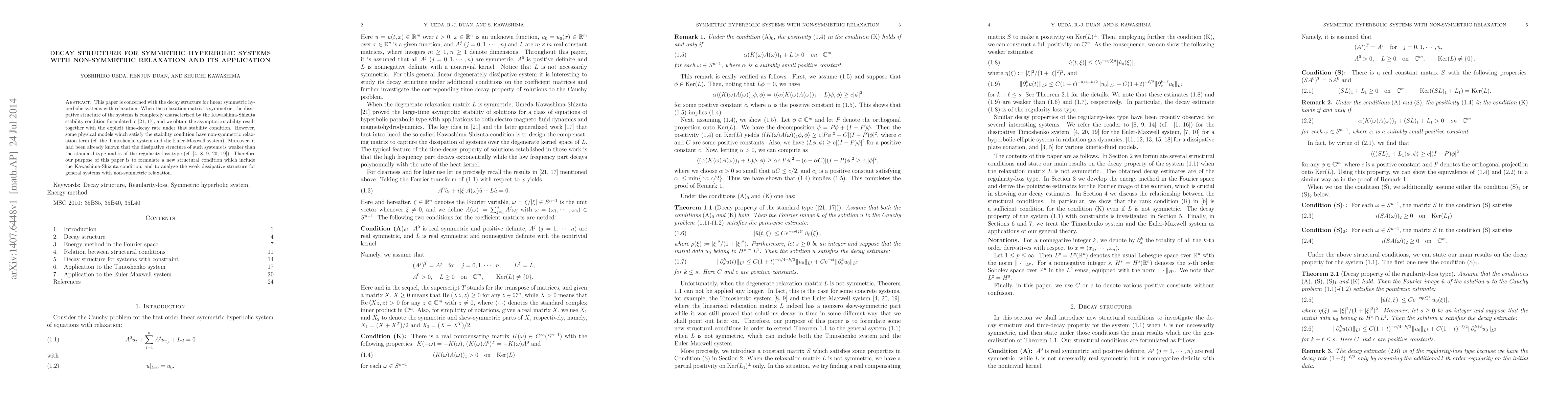 This paper is concerned with the decay structure for linear symmetric hyperbolic systems with relaxation. When the relaxation matrix is symmetric, the dissipative structure of the systems is completely characterized by the Kawashima-Shizuta stability condition formulated in \cite{UKS84,SK85}, and we obtain the asymptotic stability result together with the explicit time-decay rate under that stability condition. However, some physical models which satisfy the stability condition have non-symmetric relaxation term (cf.~the Timoshenko system and the Euler-Maxwell system). Moreover, it had been already known that the dissipative structure of such systems is weaker than the standard type and is of the regularity-loss type (cf.~\cite{D,IHK08,IK08,USK,UK}). Therefore our purpose of this paper is to formulate a new structural condition which include the Kawashima-Shizuta condition, and to analyze the weak dissipative structure for general systems with non-symmetric relaxation.
