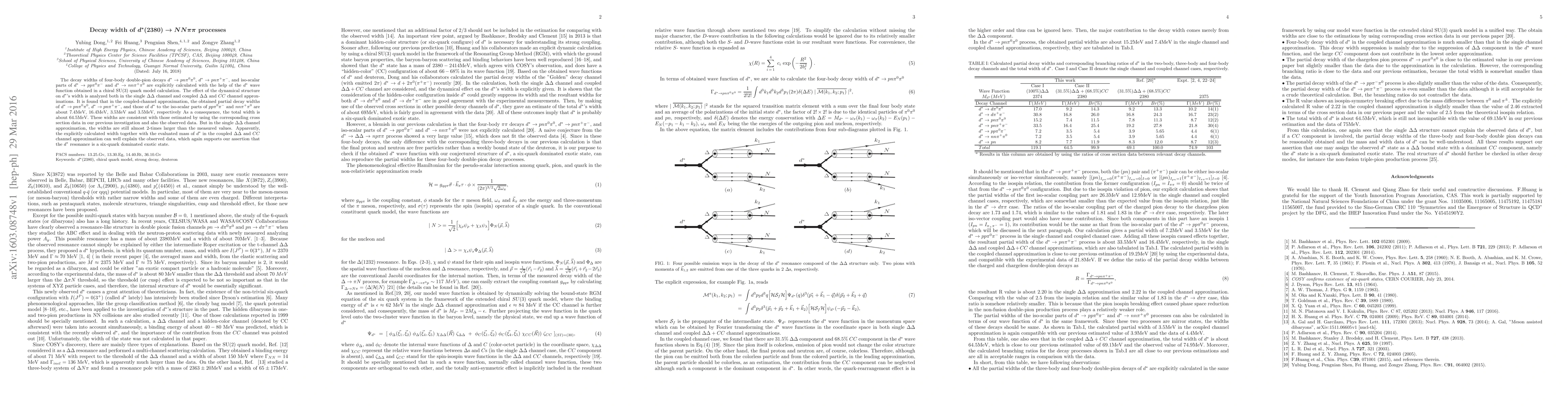 The decay widths of four-body double-pion decays $\ds\to pn \pi^0\pi^0$, $\ds\to pn \pi^+\pi^-$, and iso-scalar parts of $\ds\to pp \pi^0\pi^-$ and $\ds\to nn \pi^+\pi^0$ are explicitly calculated with the help of the $d^*$ wave function obtained in a chiral SU(3) quark model calculation. The effect of the dynamical structure on $\ds$'s width is analyzed both in the single $\Delta\Delta$ channel and coupled $\Delta\Delta$ and $CC$ channel approximations. It is found that in the coupled-channel approximation, the obtained partial decay widths of $\ds\to pn \pi^0\pi^0$, $\ds\to pn \pi^+\pi^-$, and those of $d^*$ to the iso-scalar parts of $pp \pi^0\pi^-$ and $nn \pi^+\pi^0$ are about $7.4$MeV, $16.4$MeV, $3.5$MeV and $3.5$MeV, respectively As a consequence, the total width is about $64.5$MeV. These widths are consistent with those estimated by using the corresponding cross section data in our previous investigation and also the observed data. But in the single $\Delta\Delta$ channel approximation, the widths are still almost 2-times larger than the measured values. Apparently, the explicitly calculated width together with the evaluated mass of $d^*$ in the coupled $\Delta\Delta$ and $CC$ channel approximation can well explain the observed data, which again supports our assertion that the $\ds$ resonance is a six-quark dominated exotic state.