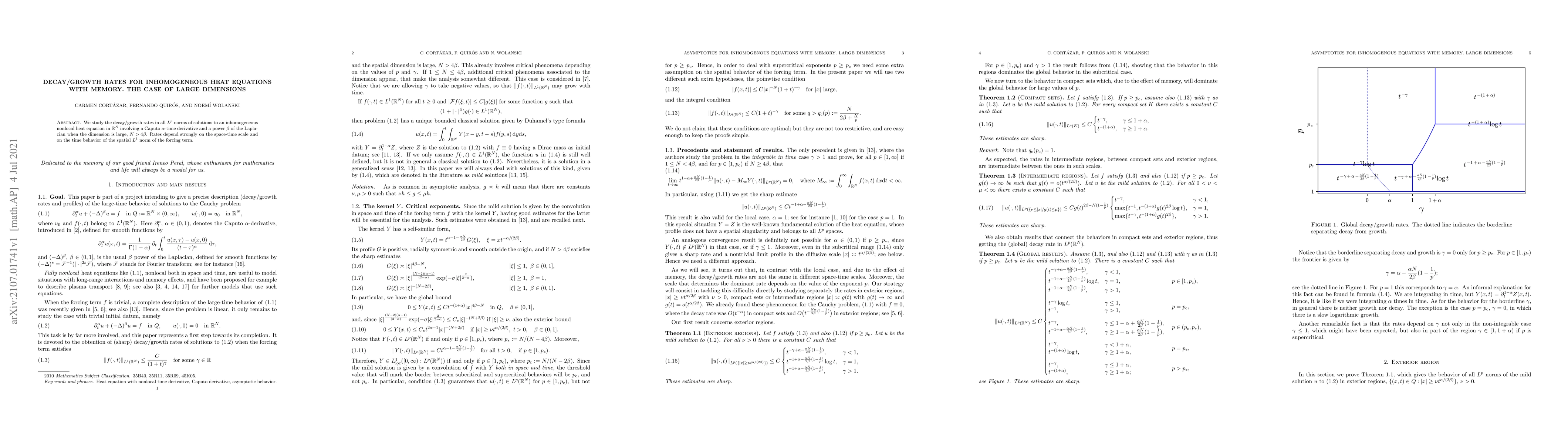 We study the decay/growth rates in all $L^p$ norms of solutions to an inhomogeneous nonlocal heat equation in $\mathbb{R}^N$ involving a Caputo $\alpha$-time derivative and a power $\beta$ of the Laplacian when the dimension is large, $N> 4\beta$. Rates depend strongly on the space-time scale and on the time behavior of the spatial $L^1$ norm of the forcing term.