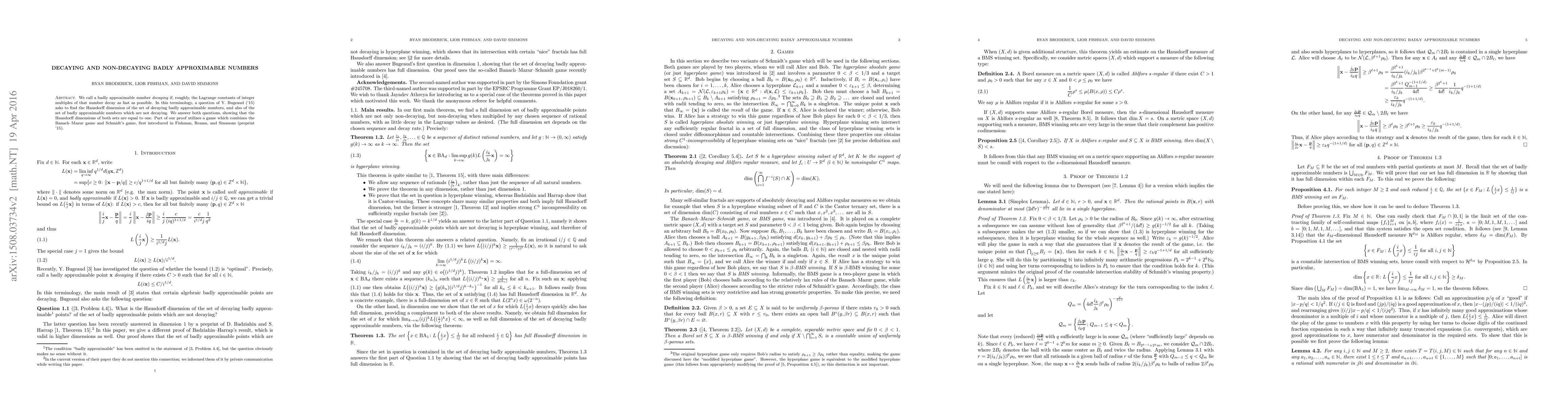 This paper addresses the classification of badly approximable numbers into decaying and non-decaying types, where decaying numbers have optimal decay in their Lagrange constants. The authors find that both sets of these numbers have a Hausdorff dimension of one, resolving a question posed by Y. Bugeaud. The proof involves a novel game combining the Banach-Mazur game and Schmidt's game.
