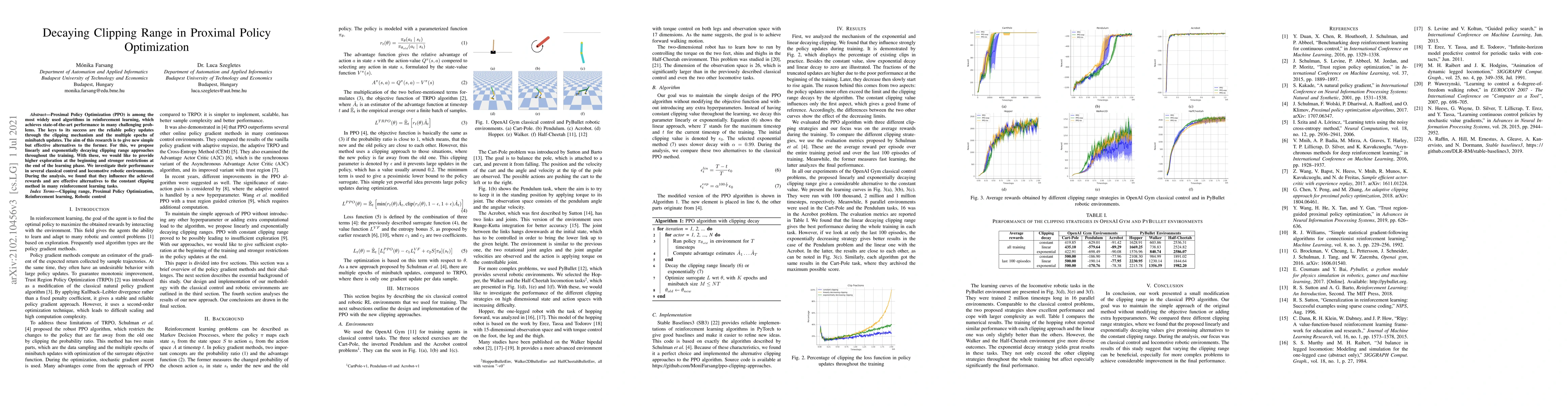 Proximal Policy Optimization (PPO) is among the most widely used algorithms in reinforcement learning, which achieves state-of-the-art performance in many challenging problems. The keys to its success are the reliable policy updates through the clipping mechanism and the multiple epochs of minibatch updates. The aim of this research is to give new simple but effective alternatives to the former. For this, we propose linearly and exponentially decaying clipping range approaches throughout the training. With these, we would like to provide higher exploration at the beginning and stronger restrictions at the end of the learning phase. We investigate their performance in several classical control and locomotive robotic environments. During the analysis, we found that they influence the achieved rewards and are effective alternatives to the constant clipping method in many reinforcement learning tasks.