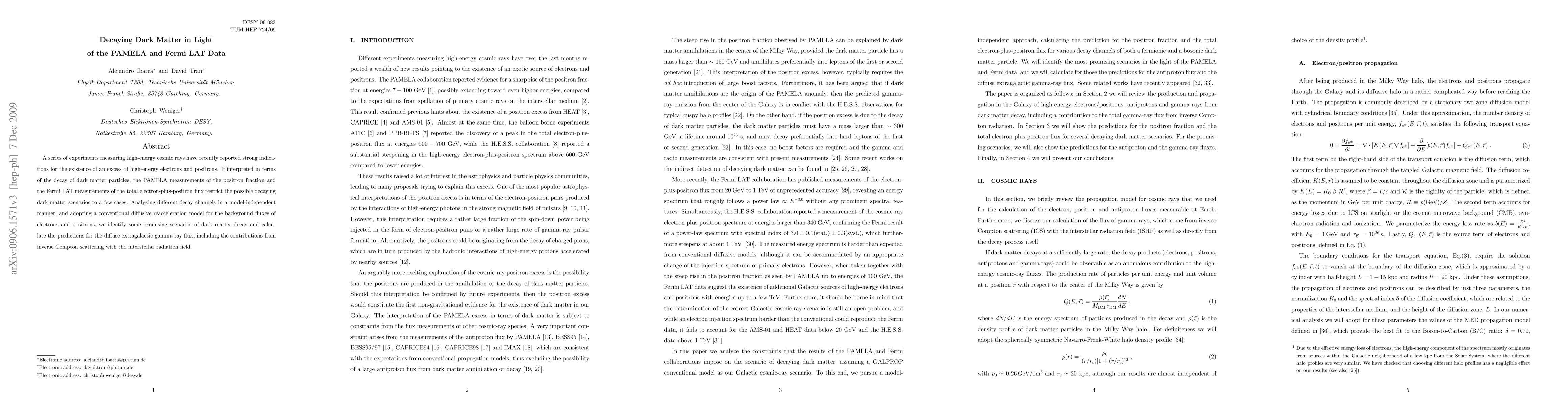 A series of experiments measuring high-energy cosmic rays have recently reported strong indications for the existence of an excess of high-energy electrons and positrons. If interpreted in terms of the decay of dark matter particles, the PAMELA measurements of the positron fraction and the Fermi LAT measurements of the total electron-plus-positron flux restrict the possible decaying dark matter scenarios to a few cases. Analyzing different decay channels in a model-independent manner, and adopting a conventional diffusive reacceleration model for the background fluxes of electrons and positrons, we identify some promising scenarios of dark matter decay and calculate the predictions for the diffuse extragalactic gamma-ray flux, including the contributions from inverse Compton scattering with the interstellar radiation field.