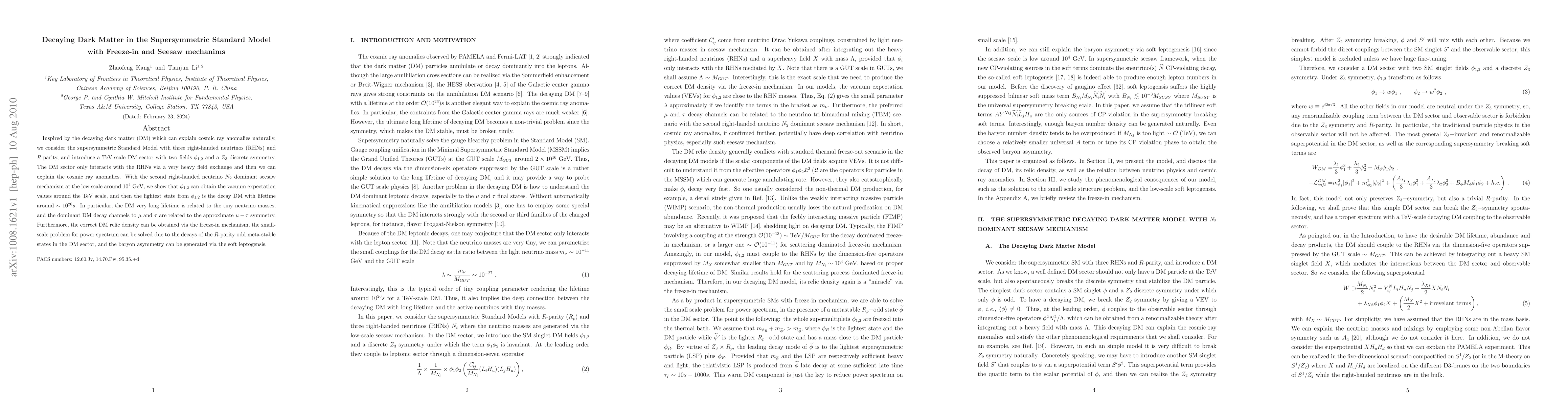 Inspired by the decaying dark matter (DM) which can explain cosmic ray anomalies naturally, we consider the supersymmetric Standard Model with three right-handed neutrinos (RHNs) and R-parity, and introduce a TeV-scale DM sector with two fields \phi_{1,2} and a $Z_3$ discrete symmetry. The DM sector only interacts with the RHNs via a very heavy field exchange and then we can explain the cosmic ray anomalies. With the second right-handed neutrino N_2 dominant seesaw mechanism at the low scale around 10^4 GeV, we show that \phi_{1,2} can obtain the vacuum expectation values around the TeV scale, and then the lightest state from \phi_{1,2} is the decay DM with lifetime around \sim 10^{26}s. In particular, the DM very long lifetime is related to the tiny neutrino masses, and the dominant DM decay channels to \mu and \tau are related to the approximate \mu-\tau symmetry. Furthermore, the correct DM relic density can be obtained via the freeze-in mechanism, the small-scale problem for power spectrum can be solved due to the decays of the R-parity odd meta-stable states in the DM sector, and the baryon asymmetry can be generated via the soft leptogensis.