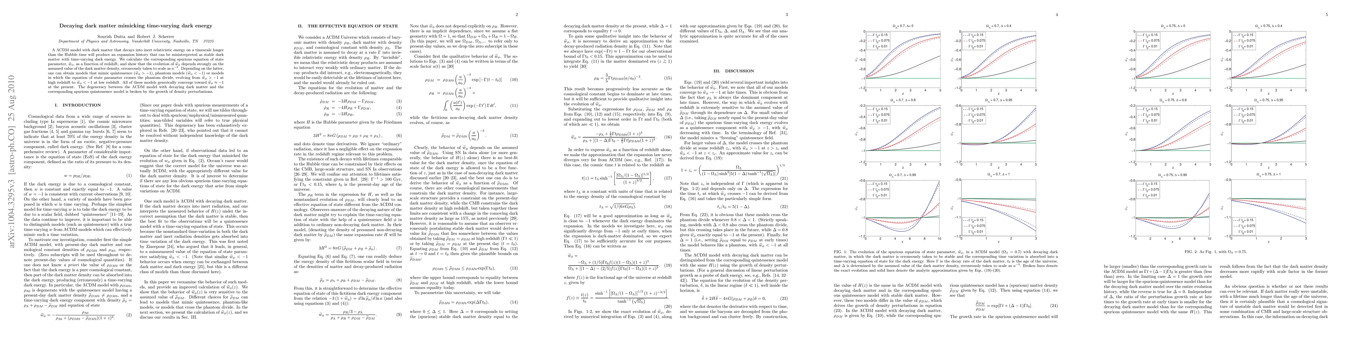 This paper explores how decaying dark matter can mimic time-varying dark energy in the $\Lambda$CDM model, calculating the spurious equation of state parameter $\widetilde w_\phi$ that depends on the assumed dark matter density. The study reveals that the evolution of $\widetilde w_\phi$ can simulate quintessence, phantom models, or crossing the phantom divide, converging to $\widetilde w_\phi \approx -1$ today, with the degeneracy breaking due to the growth of density perturbations.