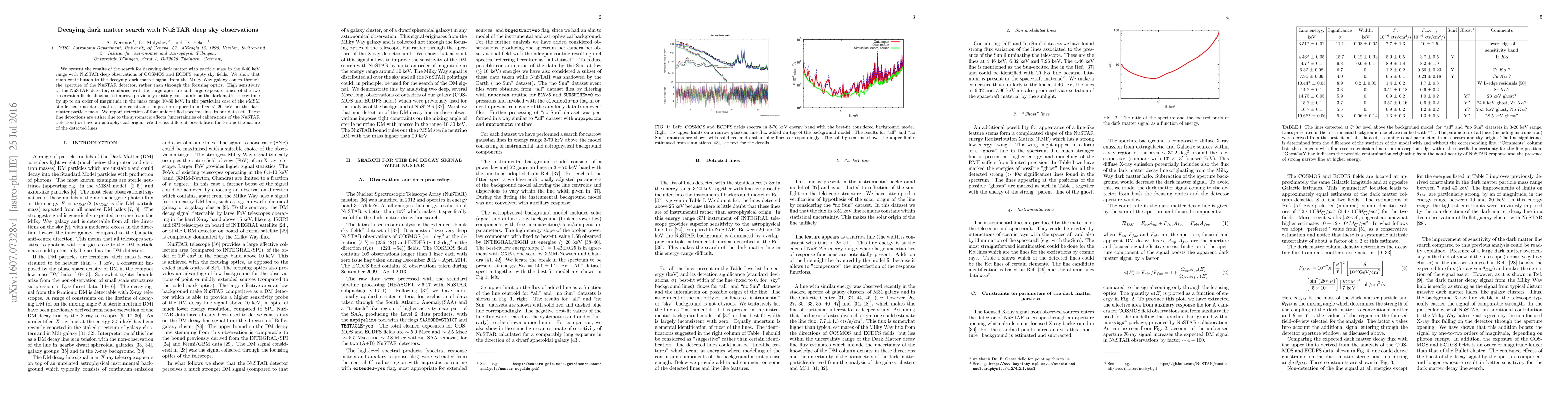 The research utilized NuSTAR deep observations of COSMOS and ECDFS empty sky fields to search for decaying dark matter with particle mass in the 6-40 keV range.