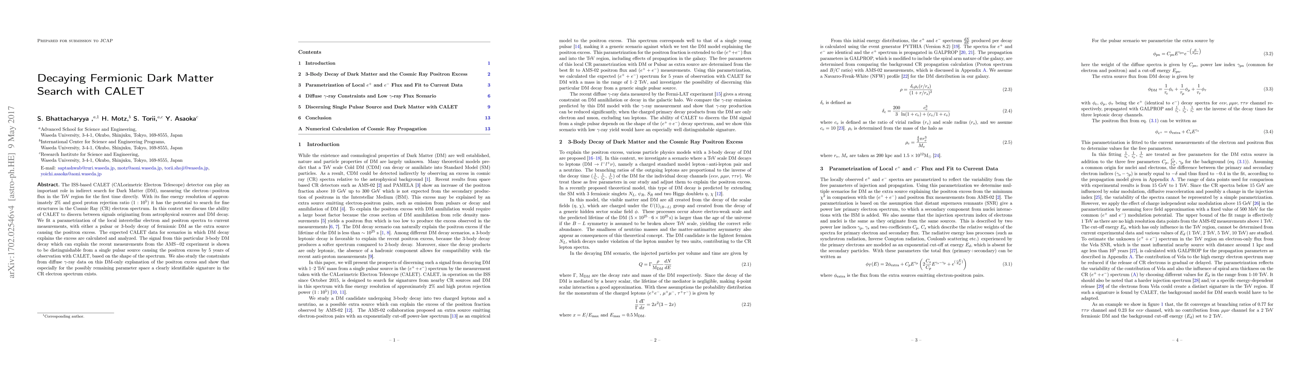 The ISS-based CALET (CALorimetric Electron Telescope) detector can play an important role in indirect search for Dark Matter (DM), measuring the electron+positron flux in the TeV region for the first time directly. With its fine energy resolution of approximately $2\%$ and good proton rejection ratio ($1:10^5$) it has the potential to search for fine structures in the Cosmic Ray (CR) electron spectrum. In this context we discuss the ability of CALET to discern between signals originating from astrophysical sources and DM decay or annihilation. We fit a parametrization of the local interstellar electron and positron spectra to current measurements, with either a pulsar or 3-body decay of fermionic DM as the extra source causing the positron excess. The expected CALET data for scenarios in which DM decay explains the excess are calculated and analyzed. The signal from this particular 3-body DM decay which can explain the recent measurements of from the AMS$-02$ experiment is shown to be distinguishable from a single pulsar source causing the positron excess by 5 years of observation with CALET, based on the shape of the spectrum. We also study the constraints from extra-galactic diffuse $\gamma$-ray data on this DM-only explanation of the positron excess and show that especially for the possibly remaining parameter space a clearly identifiable signature in the CR electron spectrum exists.