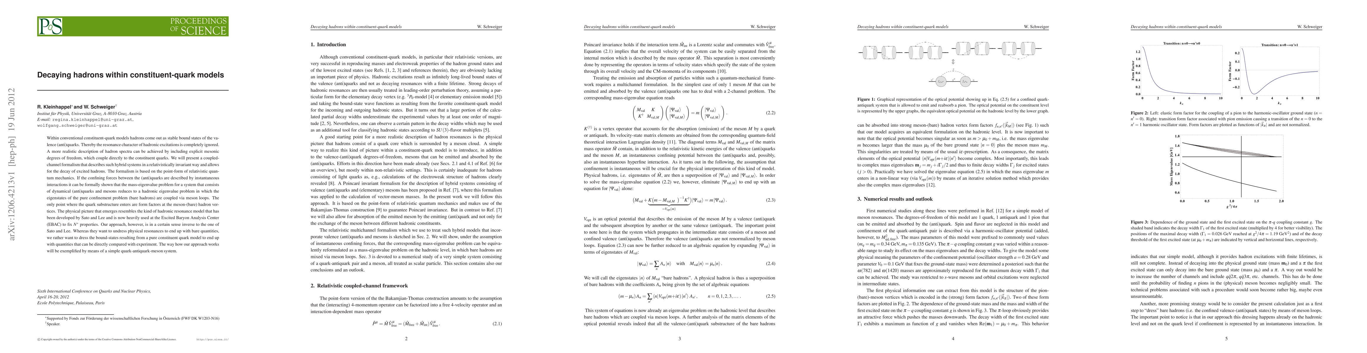 This paper proposes a coupled-channel formalism within the point-form of relativistic quantum mechanics to describe decaying hadrons in constituent-quark models, incorporating explicit mesonic degrees of freedom. The approach aims to dress pure constituent quark model bound states to match experimental data, contrasting with existing models that undress resonances to find bare quantities.