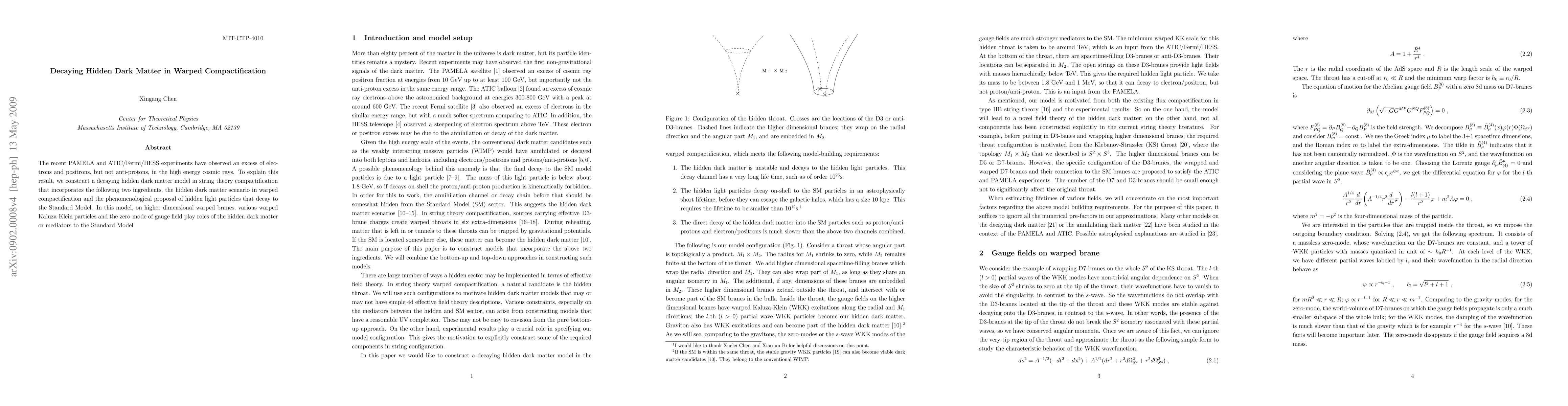 This paper proposes a decaying hidden dark matter model in warped string theory compactification to explain the observed excess of electrons and positrons in high-energy cosmic rays, without an excess of anti-protons, using hidden light particles that decay into the Standard Model. The model involves warped Kaluza-Klein particles and gauge field zero-modes acting as dark matter or mediators.