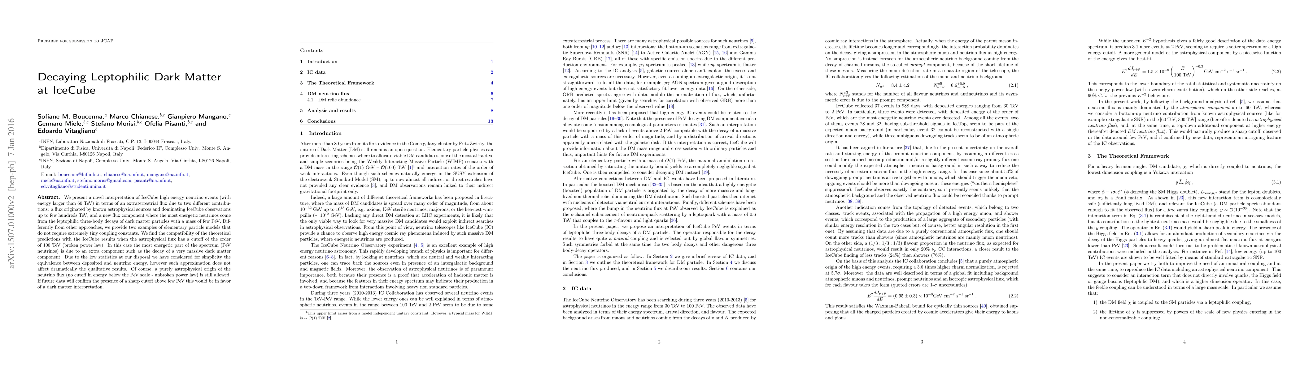 We present a novel interpretation of IceCube high energy neutrino events (with energy larger than 60 TeV) in terms of an extraterrestrial flux due to two different contributions: a flux originated by known astrophysical sources and dominating IceCube observations up to few hundreds TeV, and a new flux component where the most energetic neutrinos come from the leptophilic three-body decays of dark matter particles with a mass of few PeV. Differently from other approaches, we provide two examples of elementary particle models that do not require extremely tiny coupling constants. We find the compatibility of the theoretical predictions with the IceCube results when the astrophysical flux has a cutoff of the order of 100 TeV (broken power law). In this case the most energetic part of the spectrum (PeV neutrinos) is due to an extra component such as the decay of a very massive dark matter component. Due to the low statistics at our disposal we have considered for simplicity the equivalence between deposited and neutrino energy, however such approximation does not affect dramatically the qualitative results. Of course, a purely astrophysical origin of the neutrino flux (no cutoff in energy below the PeV scale - unbroken power law) is still allowed. If future data will confirm the presence of a sharp cutoff above few PeV this would be in favor of a dark matter interpretation.
