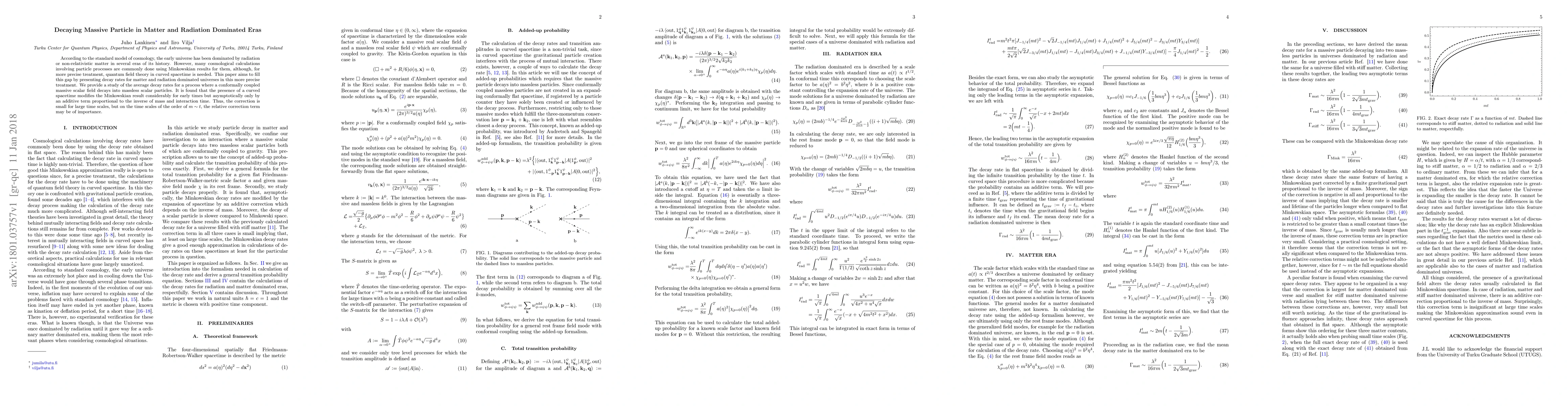 This paper investigates decay rates for a conformally coupled massive scalar field in both radiation and matter-dominated eras using quantum field theory in curved spacetime, finding significant modifications to Minkowskian results for early times, with small corrections for large time scales.