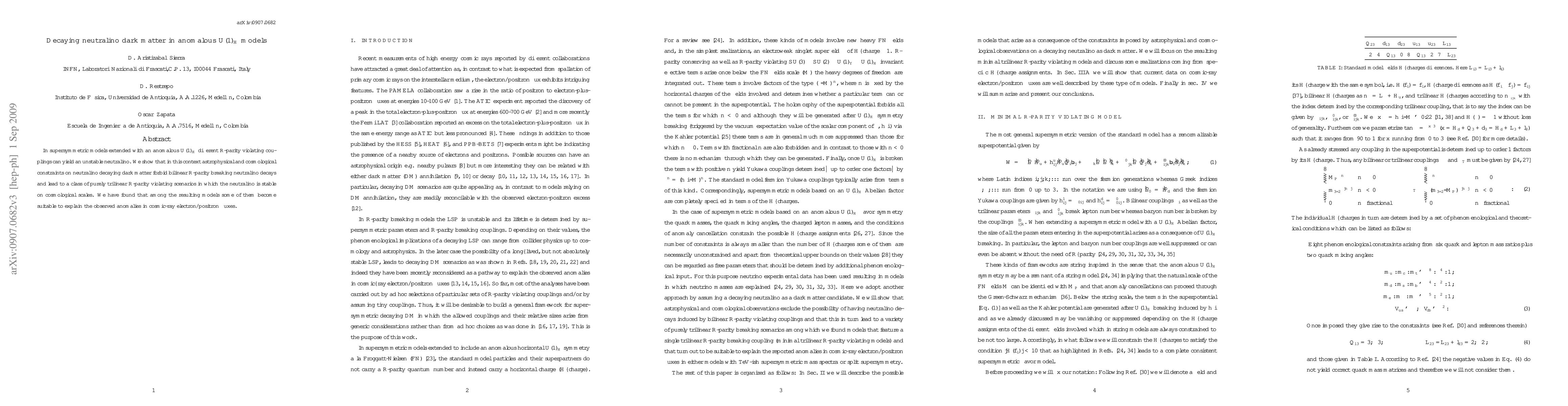 This paper explores the implications of an anomalous $U(1)_H$ extension in supersymmetric models, demonstrating that astrophysical and cosmological constraints favor purely trilinear R-parity violating scenarios for a stable neutralino. Some of these models can potentially explain observed anomalies in cosmic-ray electron/positron fluxes.