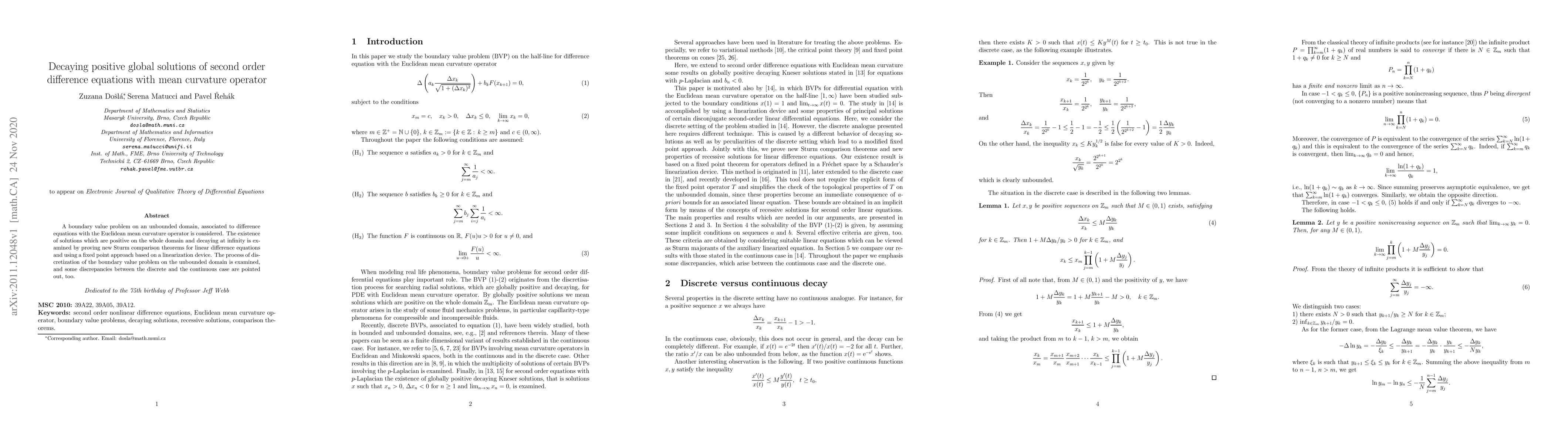 A boundary value problem on an unbounded domain, associated to difference equations with the Euclidean mean curvature operator is considered. The existence of solutions which are positive on the whole domain and decaying at infinity is examined by proving new Sturm comparison theorems for linear difference equations and using a fixed point approach based on a linearization device. %The process from the continuous problem to discrete one is examined, too. The process of discretization of the boundary value problem on the unbounded domain is examined, and some discrepancies between the discrete and the continuous case are pointed out, too.