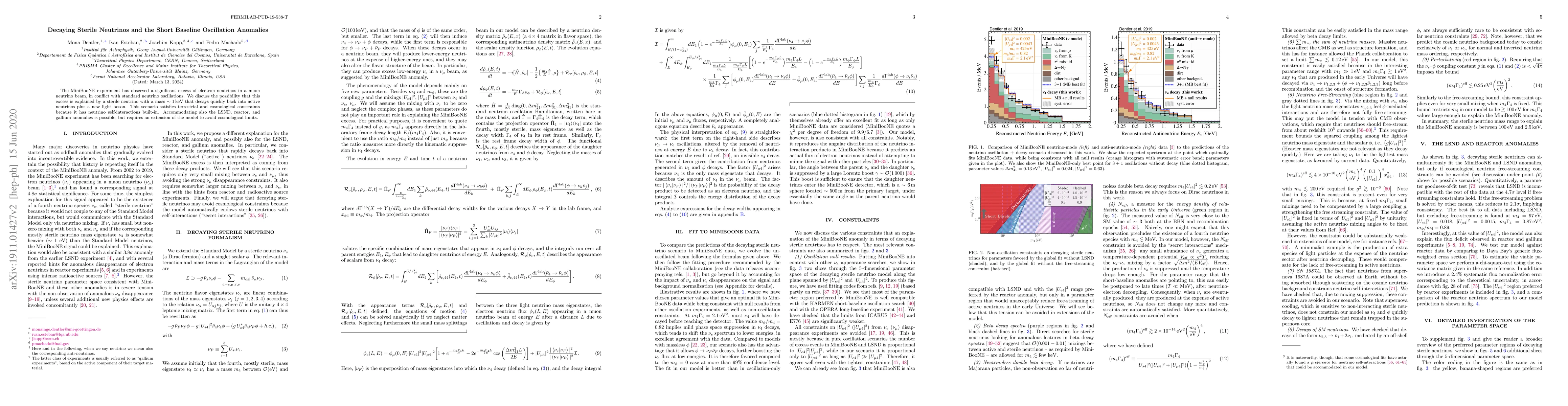 The MiniBooNE experiment observes a short baseline oscillation anomaly potentially explained by a decaying sterile neutrino that mixes predominantly with electron neutrinos, with a mass range of 100 eV to 1 keV, while satisfying cosmological constraints through "secret interactions." Extending the model to accommodate other anomalies requires modifications to avoid cosmological limits.