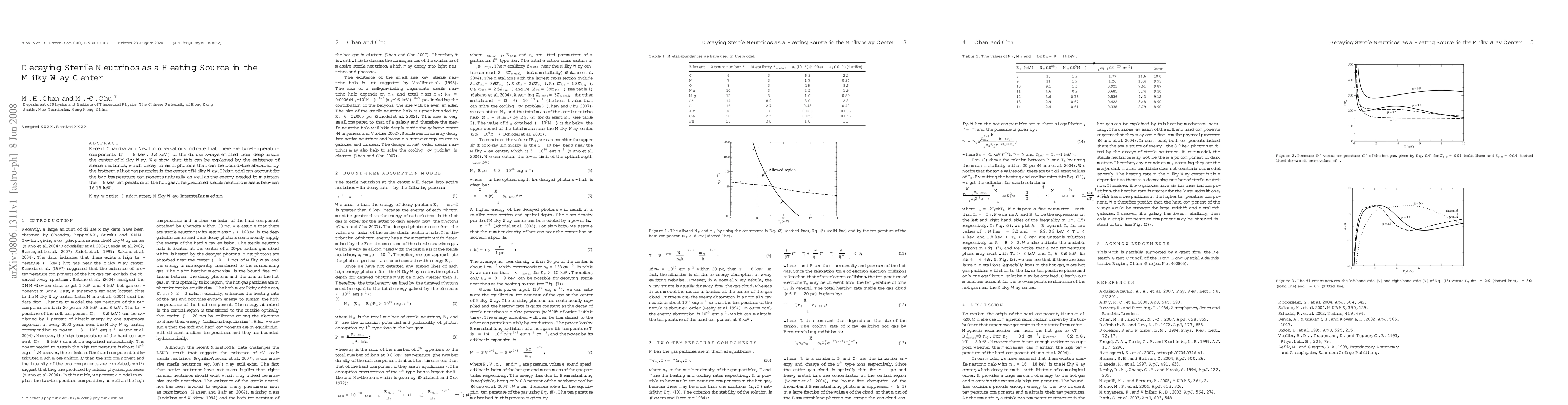 This paper proposes that decaying sterile neutrinos could be the source of heating in the Milky Way's center, explaining the observed two-temperature components in its diffuse x-ray emissions. The model suggests these neutrinos decay to emit photons absorbed by hot gas, maintaining the 8 keV temperature, with a predicted mass of 16-18 keV.
