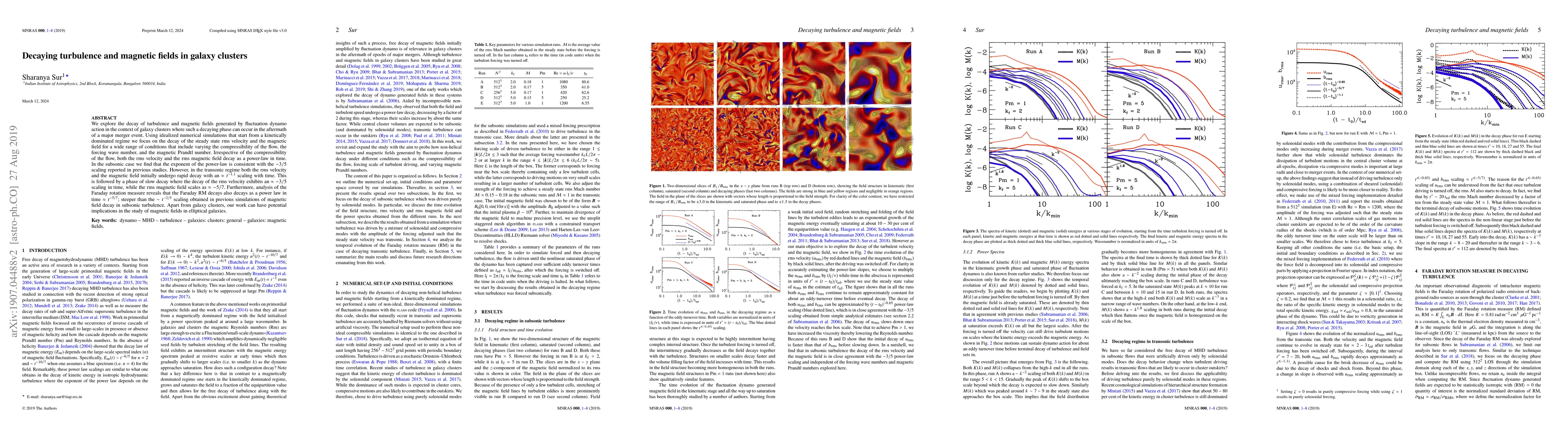 This study investigates the decay of turbulence and magnetic fields in galaxy clusters post-merger, using numerical simulations. Both rms velocity and magnetic fields decay as power-laws, with different exponents in subsonic and transonic regimes. The findings suggest a $-3/5$ scaling in subsonic turbulence and a more rapid initial decay followed by $-3/5$ scaling for velocity and $-5/7$ for magnetic fields in transonic turbulence.
