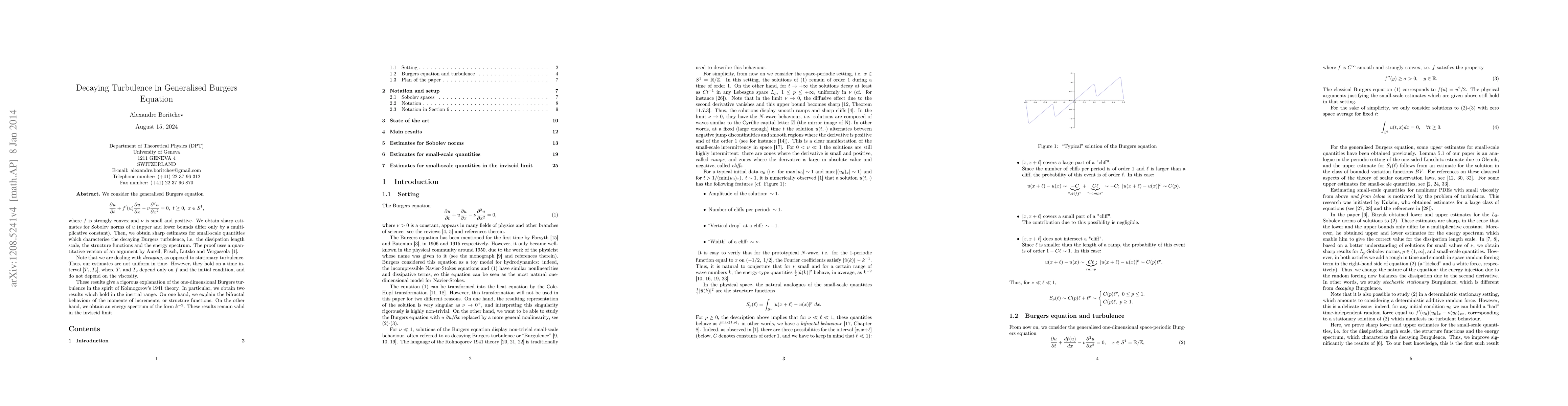 This paper studies the decaying turbulence in the generalised Burgers equation, providing sharp estimates for Sobolev norms and small-scale quantities like dissipation length scale and energy spectrum. The results support Kolmogorov's 1941 theory, revealing bifractal structure functions and a $k^{-2}$ energy spectrum in the inertial range.
