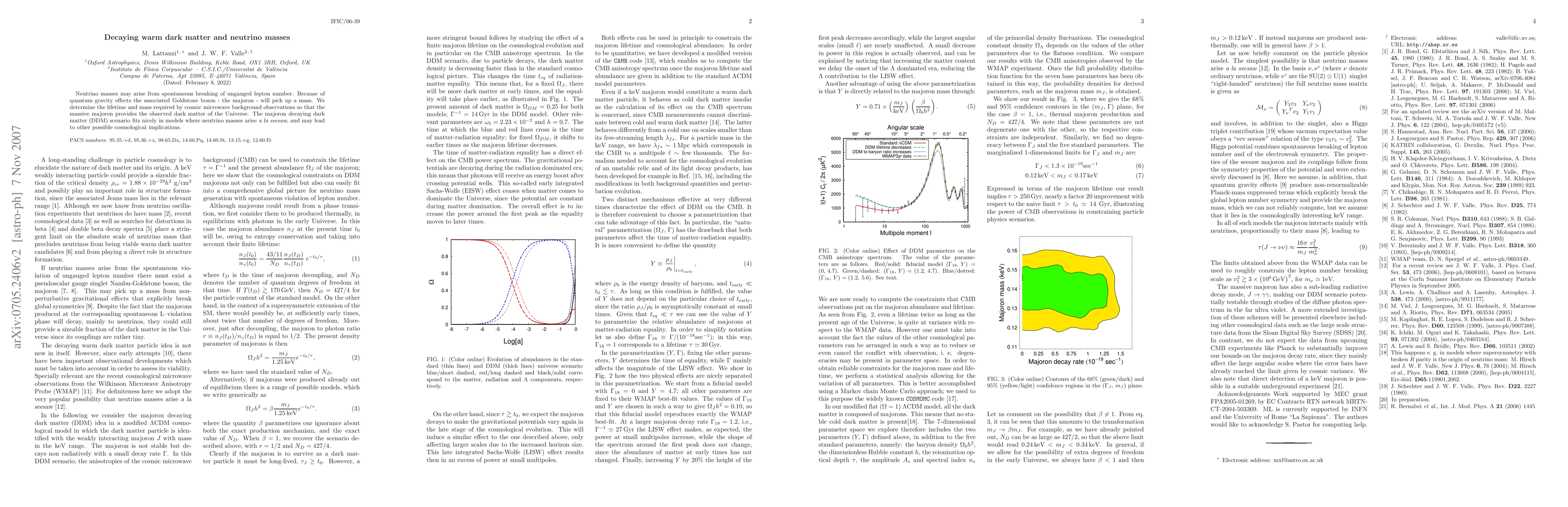 This paper explores how decaying warm dark matter (DDM) can arise from a massive majoron, a Goldstone boson resulting from spontaneous breaking of ungauged lepton number. The study determines the majoron's mass and lifetime required to match observations of the cosmic microwave background, suggesting it could serve as the Universe's dark matter.