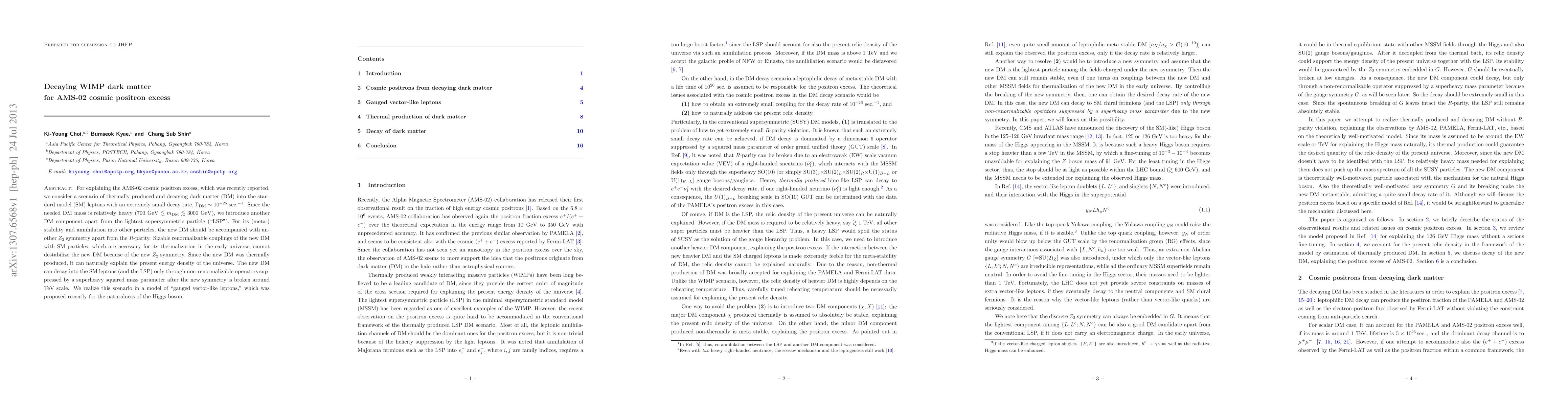 This paper proposes a decaying dark matter scenario to explain the AMS-02 cosmic positron excess, featuring a thermally produced, heavy dark matter particle with a small decay rate. The new dark matter, distinct from the lightest supersymmetric particle, requires additional Z_2 symmetry for its stability and is realized in a model with gauged vector-like leptons.
