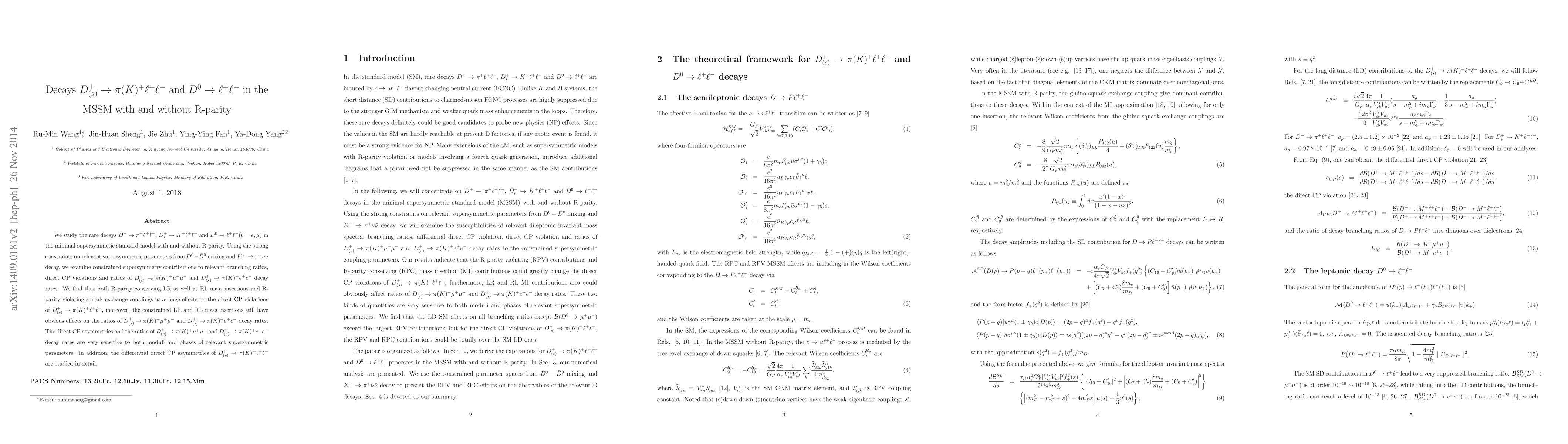 We study the rare decays $D^+\to \pi^{+}\ell^+\ell^-$, $D^+_s\to K^{+}\ell^+\ell^-$ and $D^0\to \ell^+\ell^-(\ell=e,\mu)$ in the minimal supersymmetic standard model with and without R-parity. Using the strong constraints on relevant supersymmetric parameters from $D^0-\bar{D}^0$ mixing and $K^+\to \pi^+\nu\bar{\nu}$ decay, we examine constrained supersymmetry contributions to relevant branching ratios, direct CP violations and ratios of $D^+_{(s)}\to \pi(K)^{+}\mu^+\mu^-$ and $D^+_{(s)}\to \pi(K)^{+}e^+e^-$ decay rates. We find that both R-parity conserving LR as well as RL mass insertions and R-parity violating squark exchange couplings have huge effects on the direct CP violations of $D^+_{(s)}\to \pi(K)^{+}\ell^+\ell^-$, moreover, the constrained LR and RL mass insertions still have obvious effects on the ratios of $D^+_{(s)}\to \pi(K)^{+}\mu^+\mu^-$ and $D^+_{(s)}\to \pi(K)^{+}e^+e^-$ decay rates. The direct CP asymmetries and the ratios of $D^+_{(s)}\to \pi(K)^{+}\mu^+\mu^-$ and $D^+_{(s)}\to \pi(K)^{+}e^+e^-$ decay rates are very sensitive to both moduli and phases of relevant supersymmetric parameters. In addition, the differential direct CP asymmetries of $D^+_{(s)}\to \pi(K)^{+}\ell^+\ell^-$ are studied in detail.