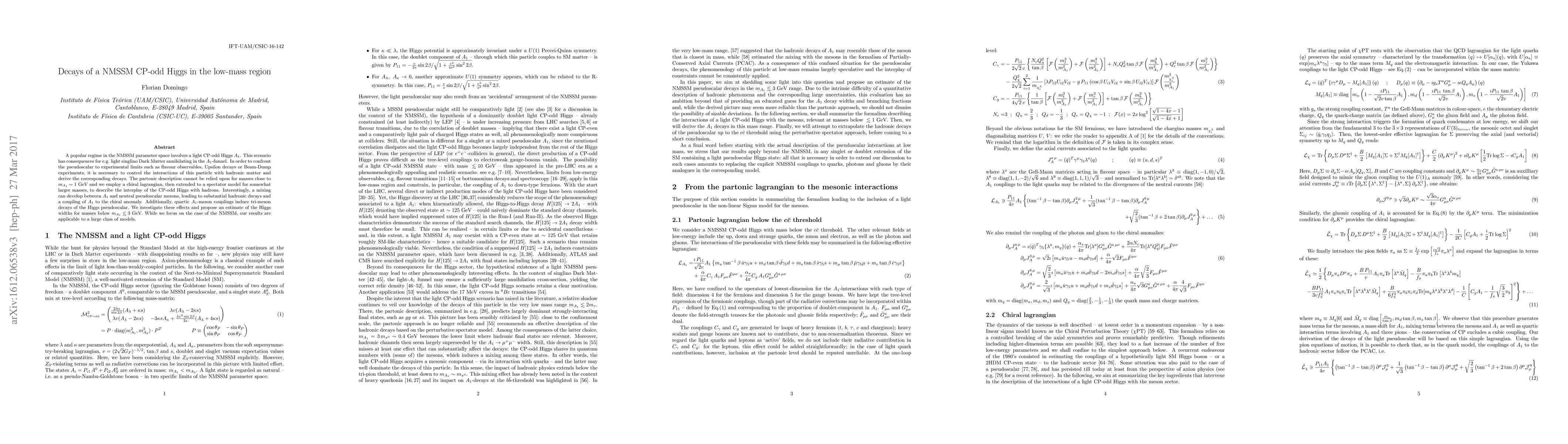 This paper investigates the decay processes of a light CP-odd Higgs ($A_1$) in the Next-to-Minimal Supersymmetric Standard Model (NMSSM), particularly in the low-mass region. It employs a chiral Lagrangian and a spectator model to describe the interactions of $A_1$ with hadronic matter, revealing significant hadronic decays and tri-meson decay channels due to mixing and quartic couplings.