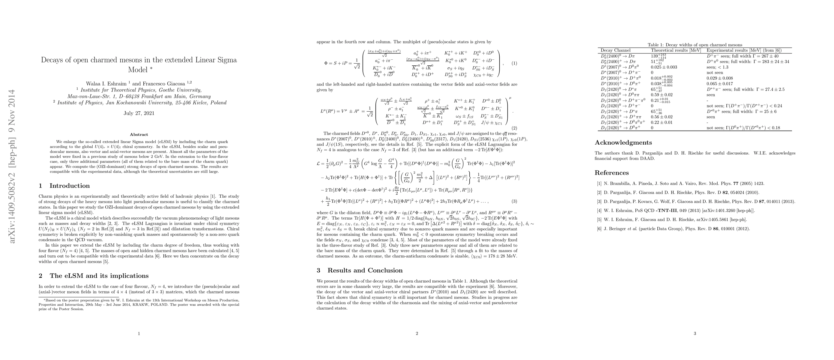 This paper extends the extended Linear Sigma Model to include charm quarks, focusing on the decay properties of open charmed mesons. The model's parameters, mostly fixed from previous studies, predict strong decay patterns that align with experimental data, though significant theoretical uncertainties remain.