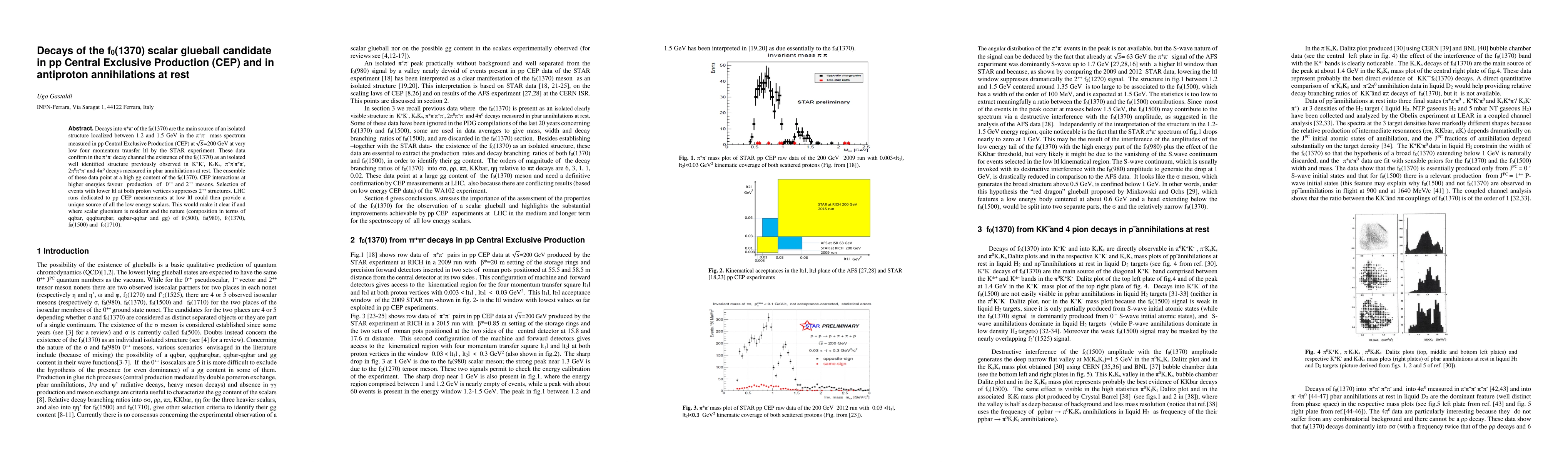 Decays into two charged pions of the f0(1370) are the main source of an isolated structure localized between 1.2 and 1.5 GeV in the two charged pions mass spectrum measured in pp Central Exclusive Production (CEP) at 200 GeV at very low four momentum transfer ltl by the STAR experiment. These data confirm in the two charged pions decay channel the existence of the f0(1370) as an isolated well identified structure previously observed in K+K-, KsKs, 4 charged pions, two charged and two neutral pions and 4 neutral pions decays measured in antiproton annihilations at rest. The ensemble of these data point at a high gluon content of the f0(1370). CEP interactions at higher energies favour production of 0++ and 2++ mesons. Selection of events with lower ltl at both proton vertices suppresses 2++ structures. LHC runs dedicated to pp CEP measurements at low ltl could then provide a unique source of all the low energy scalars. This would make it clear if and where scalar gluonium is resident and the nature (composition in terms of quarks, antiquarks and gluons) of f0(500), f0(980), f0(1370), f0(1500) and f0(1710).