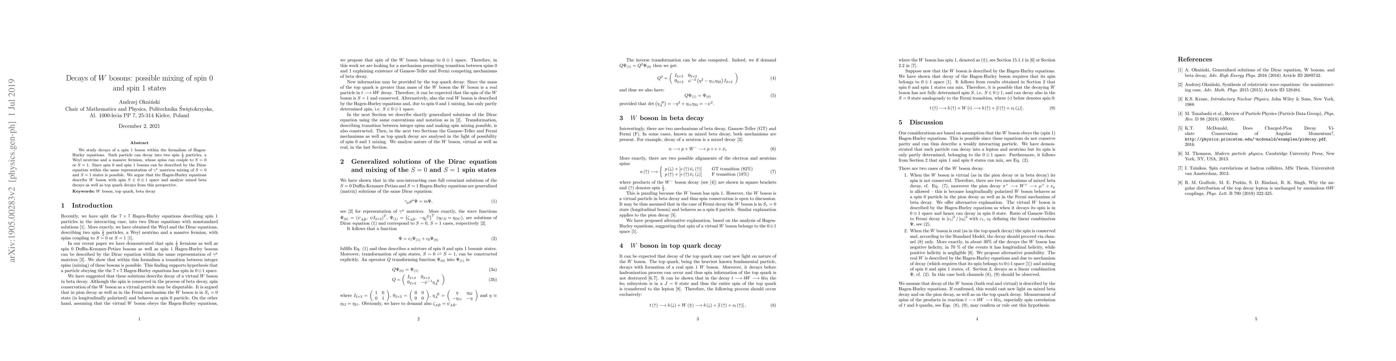 This paper explores the potential mixing of spin $0$ and spin $1$ states in the decays of $W$ bosons using the Hagen-Hurley formalism. It examines how $W$ bosons can decay into particles that couple to both spin states, analyzing mixed beta decays and top quark decays within this framework.