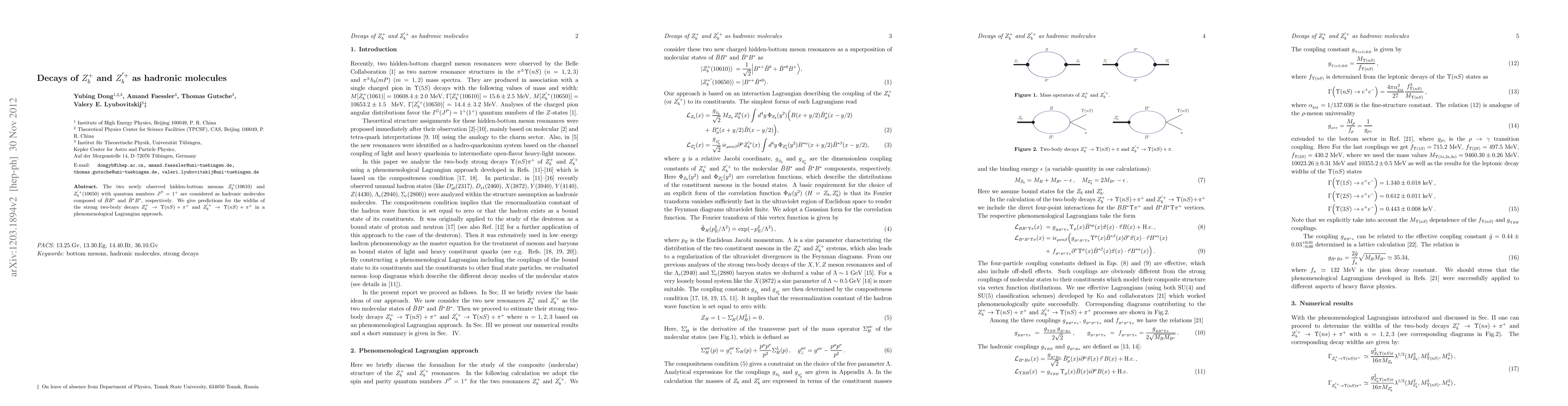 The two newly observed hidden-bottom mesons Zb(10610) and Zb'(10650) with quantum numbers J(P) = 1(+) are considered as hadronic molecules composed of BB(*) and B(*)B(*), respectively. We give predictions for the widths of the strong two-body decays Zb(+) to Upsilon(nS) + pi(+) and Zb'(+) to Upsilon(nS) + pi(+) in a phenomenological Lagrangian approach.