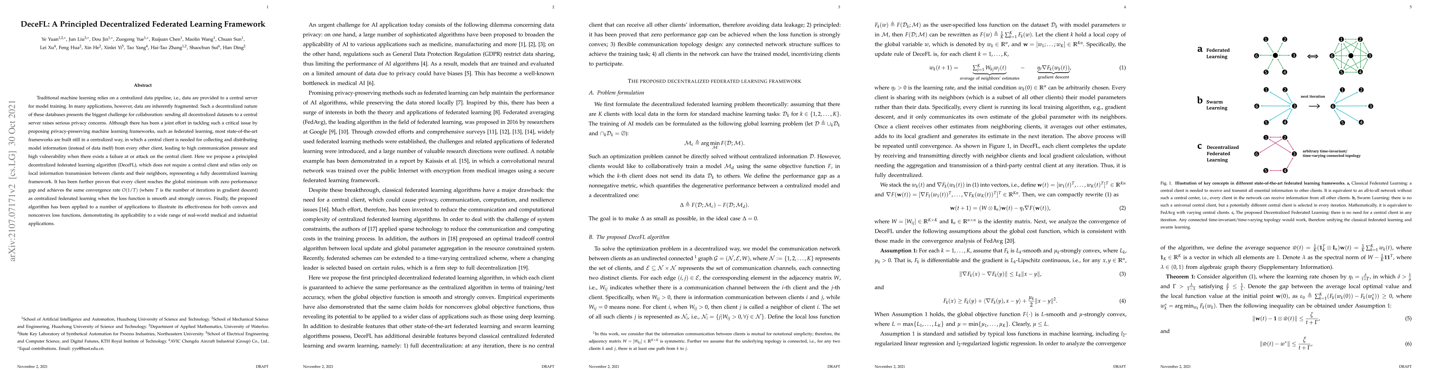 The DeceFL framework proposes a fully decentralized federated learning algorithm that eliminates the need for a central client, relying solely on local information exchanges between neighboring clients. It achieves the same convergence rate as centralized federated learning and demonstrates effectiveness across various real-world applications, addressing privacy concerns and reducing communication pressure.