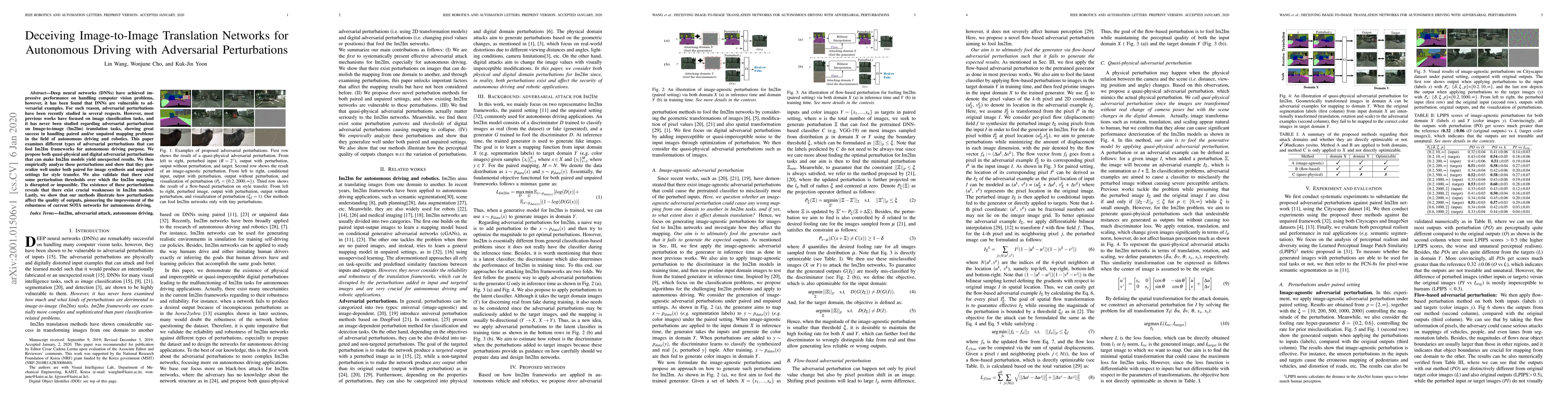 This paper investigates the vulnerability of image-to-image translation networks used in autonomous driving to adversarial perturbations, proposing both quasi-physical and digital attacks that can disrupt these models. The study reveals critical weaknesses in current state-of-the-art networks and suggests methods to improve their robustness.